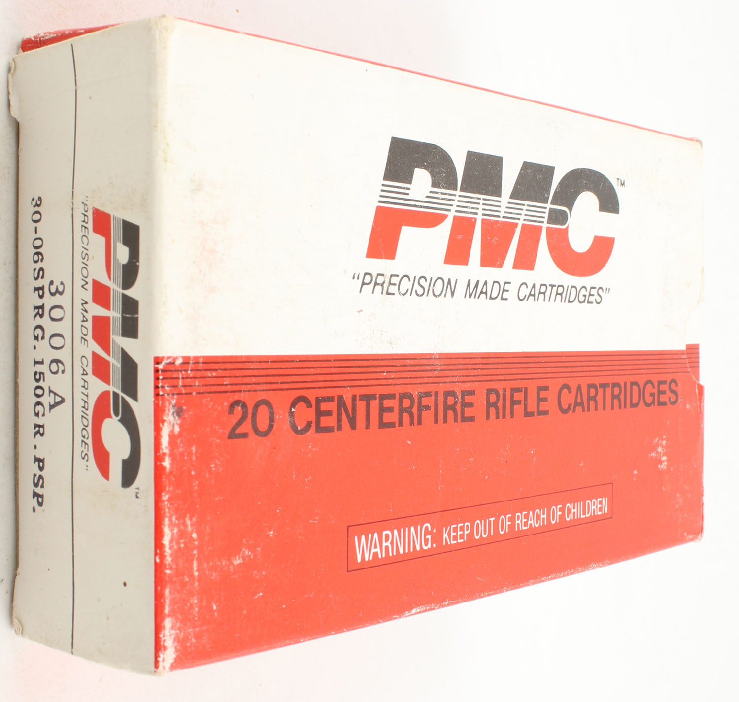 PMC, .30-06 Springfield, 150 Grain PSP, Full, 1pc, white, black & red box, box is solid with light scuffing, ammo is excellent. Grade: Excellent - Value: 14 to 21