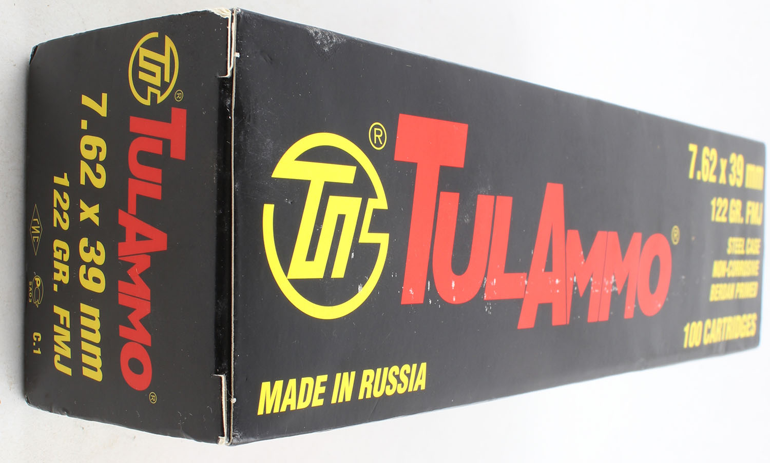 Tulammo, 7.62 x 39mm, 122 Grain FMJ, Full (100rds.) 1pc. Multi-colored box, box is very solid with excellent color, inside boxes are sealed. Grade: MINT - Value: 30 to 60