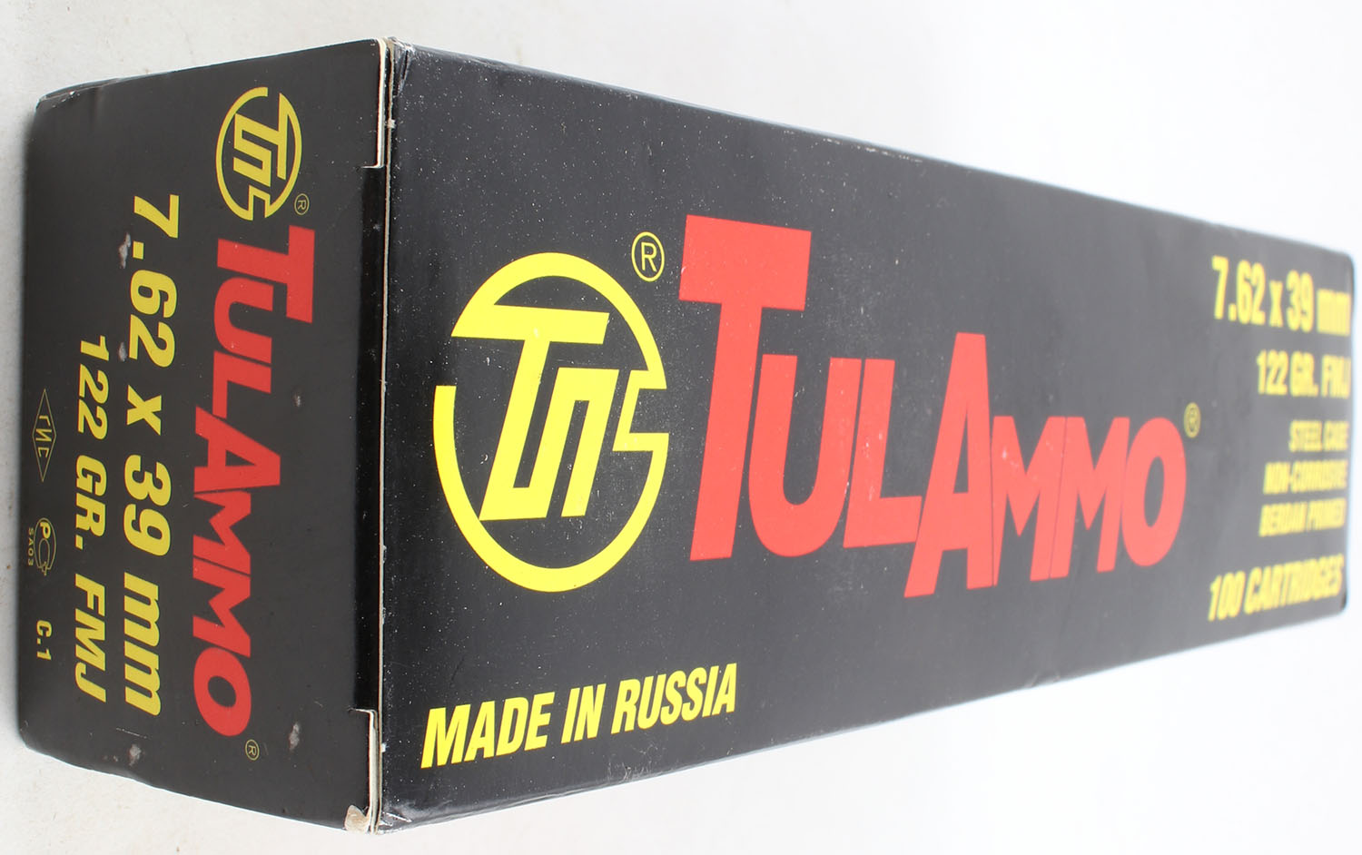 Tulammo, 7.62 x 39mm, 122 Grain FMJ, Full (100rds.) 1pc. Multi-colored box, box is very solid with excellent color, inside boxes are sealed. Grade: MINT - Value: 30 to 60