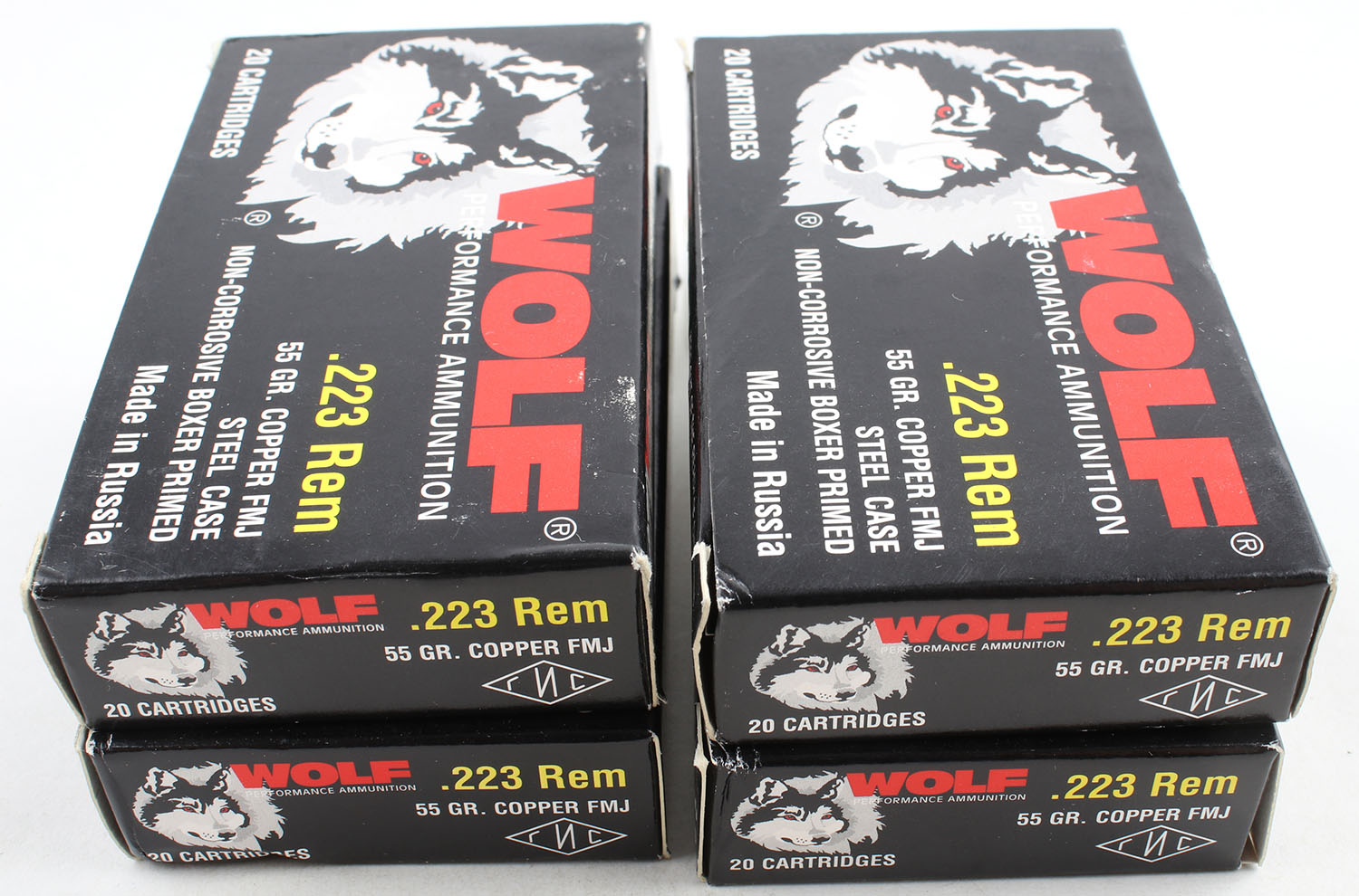 Wolf, Lot of (4), .223 Rem, 55 Grain Copper FMJ, Full, 1pc., Multi-colored boxes, boxes are very solid with excellent color, Ammo is excellent. Grade: MINT - Value: 24 to 36