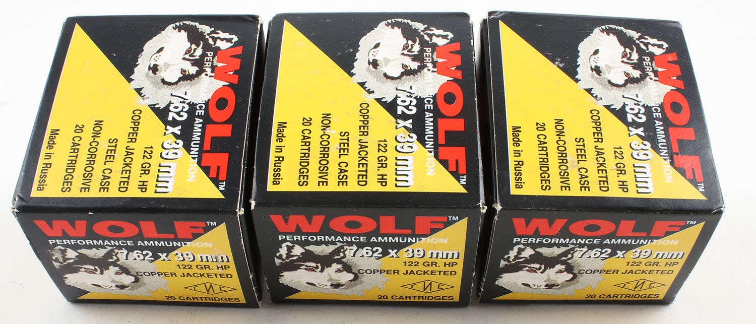 Wolf, Lot of (3), 7.62x39mm, 122 Grain Copper Jacketed Steel Case, Full (60rds), 1pc, multi-colored boxes, boxes are solid, ammo is minty. Grade: Excellent - Value: 20 to 30