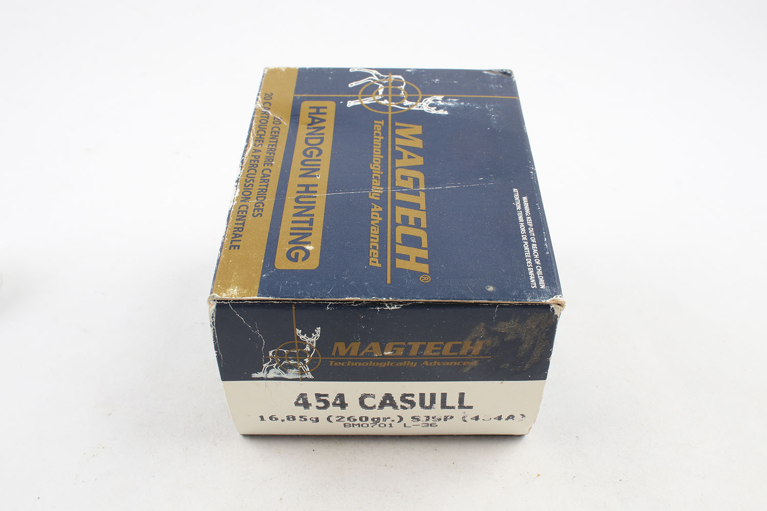 Magtech, .454 Casull, 260 Grain SJSP, Full (20 rds.), 1pc. Blue & gold box, box has light scuffing, light edge & corner wear, ammo is excellent. Grade: Very Good ++ - Value: 20 to 60
