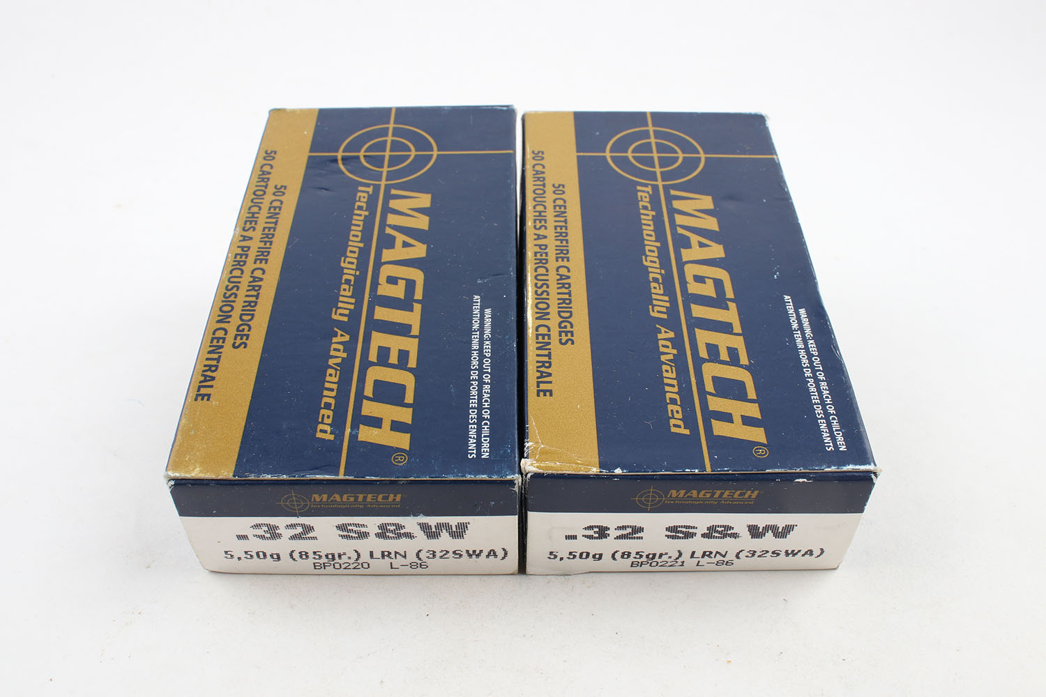 Magtech, Lot of (2), .32 Smith & Wesson, 85 Grain Lead Round Nose, Full, 1pc. Blue & gold boxes, boxes are solid with minty color, ammo is minty. Grade: Excellent ++ - Value: 24 to 50
