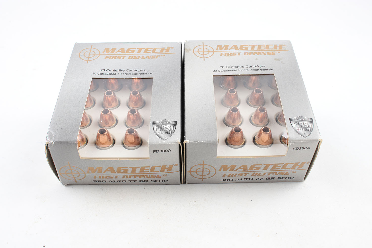 Magtech, Lot of (2), First Defense, .380 Auto, 77 Grain SCHP, Full, 1pc., Multi-colored boxes, boxes are solid, ammo is mint. Grade: Excellent - Value: 20 to 60