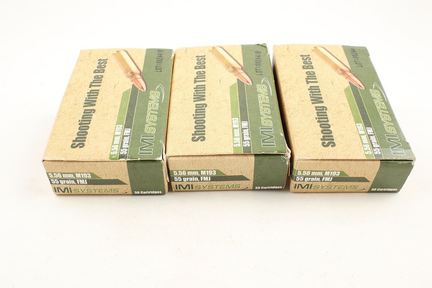 IMI Systems, Lot of (3), 5.56mm, M193, 55 Grain FMJ, Full, 1pc, multi-colored boxes, boxes are very solid, ammo is minty. Grade: Excellent - Value: 20 to 30