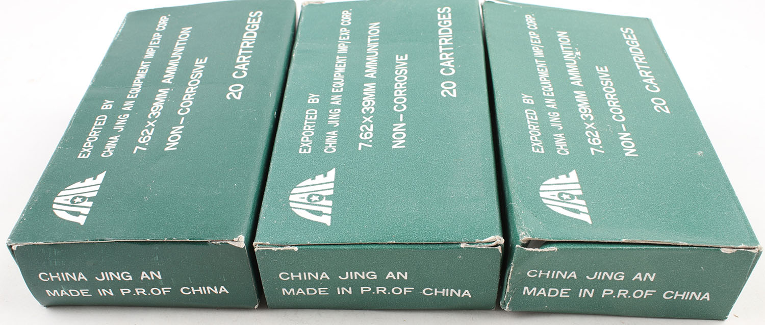 China Jing, Lot of (3), 7.62 x 39mm, Full, 1pc. Green boxes, boxes are solid with excellent color, ammo is minty. Grade: Excellent + - Value: 24 to 36