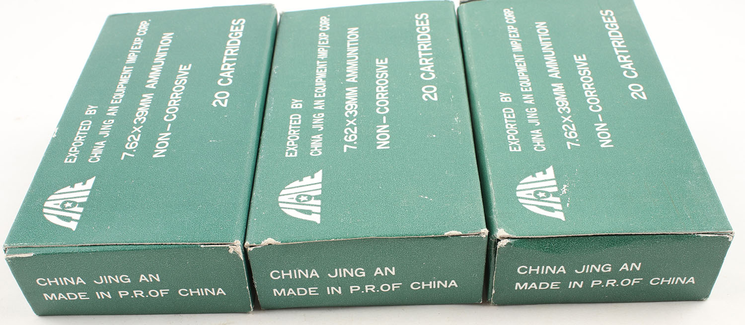 China Jing, Lot of (3), 7.62 x 39mm, Full, 1pc. Green boxes, boxes are solid with excellent color, ammo is minty. Grade: Excellent + - Value: 24 to 36