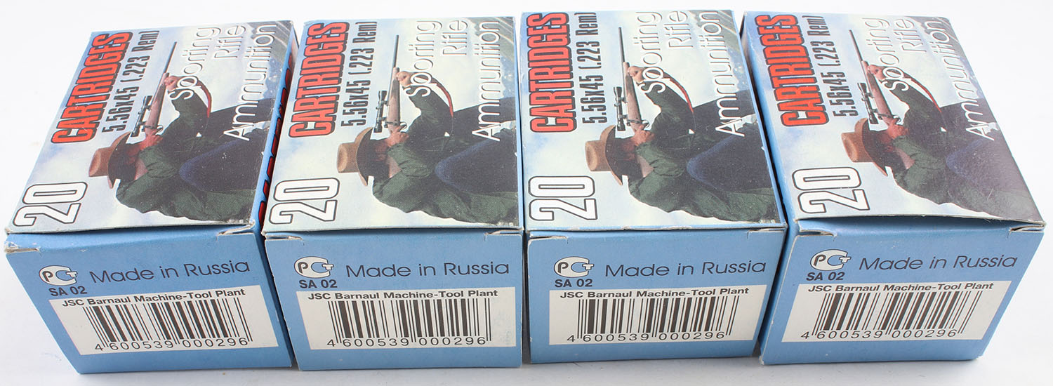 Barnaul Ammunition, Lot of (4), .223 Rem., 62 Grain FMJ BT., Full, 1pc, Multi-colored boxes, boxes are very solid, ammo is sealed in paper. Grade: Excellent ++ - Value: 20 to 30