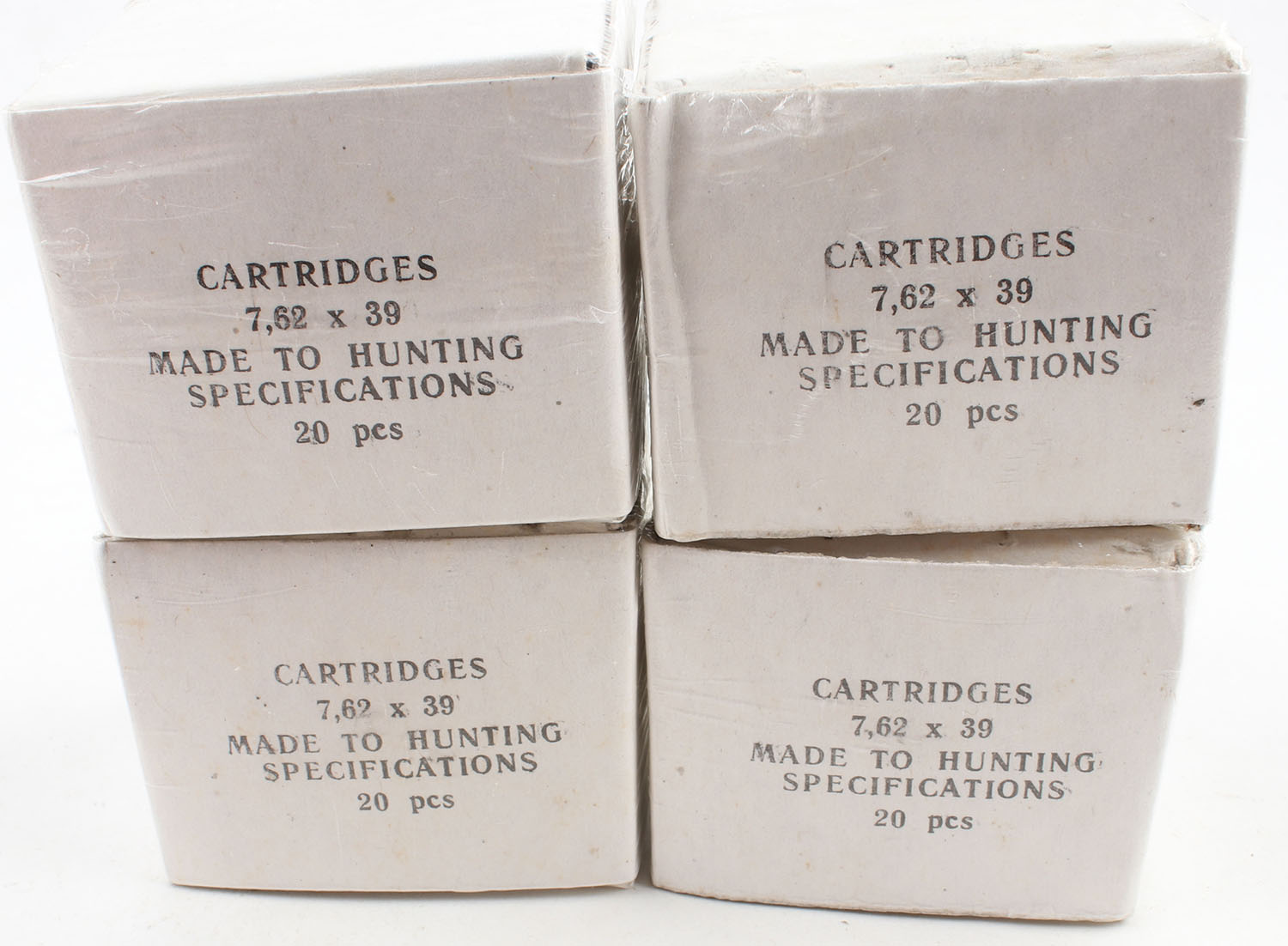 Unknown Mfg., Lot of (4), 7,62 x 39, Full, 1pc. White boxes with black print, boxes are solid, ammo is excellent. Grade: Excellent - Value: 10 to 40