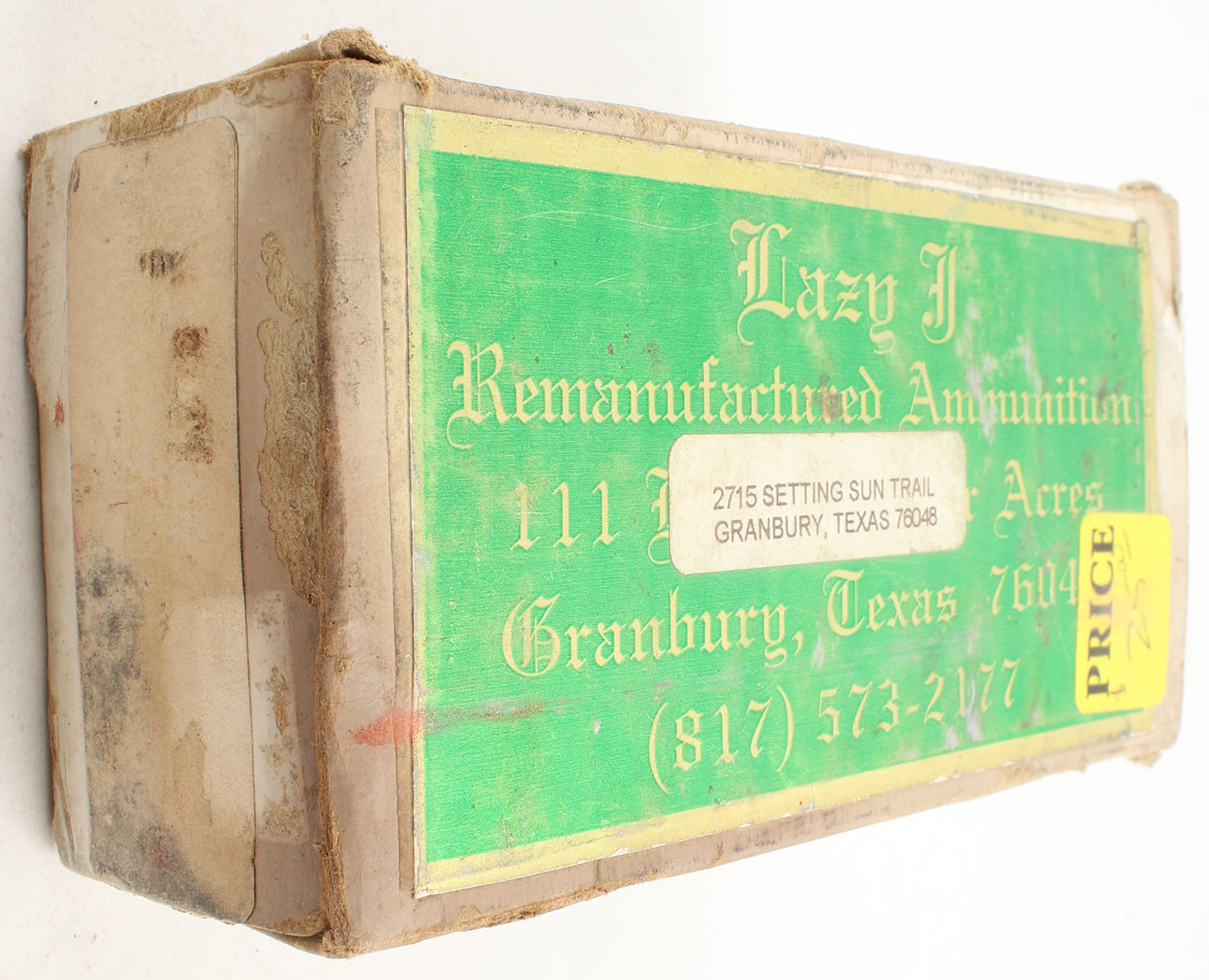 Lazy J, Remanufactured ammo., .357 Magnum, Hollow Point, Full, 1pc. White box with green label, box has light age soiling, ammo is very good. Grade: Good + - Value: 6 to 30