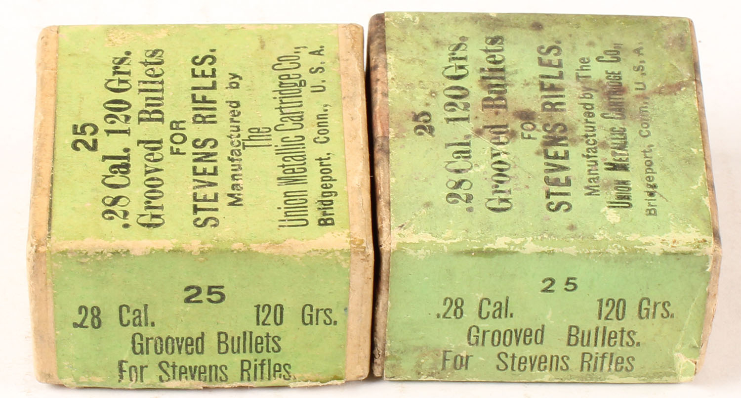 UMC, Lot of (2), .28 Cal., 120 Grains, Grooved Bullets for Stevens Rifles, (1) box is Full, (1) box is Partial 14rds., buff boxes with green label, boxes are solid, partial box has age soiling & scuffing, bullets are excellent. Grade: Very Good ++ - Value: 40 to 200