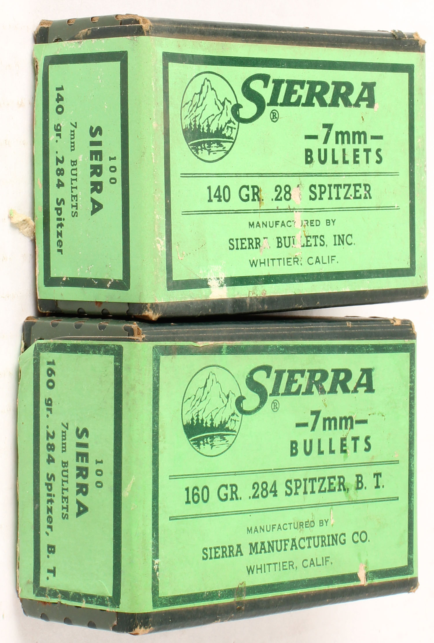Sierra, Lot of (2), 7mm, 160 & 140 Grain, .284 Spitzer, Partial, 1pc, green boxes are solid, bullets are excellent. Grade: Very Good + - Value: 10 to 40