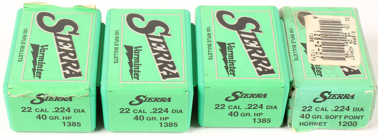 Sierra, Lot of (4), .22 Cal., 40 Grain HP, (3) Full & Sealed, (1) Partial, 1pc. Green boxes are very solid. Grade: Excellent - Value: 20 to 60