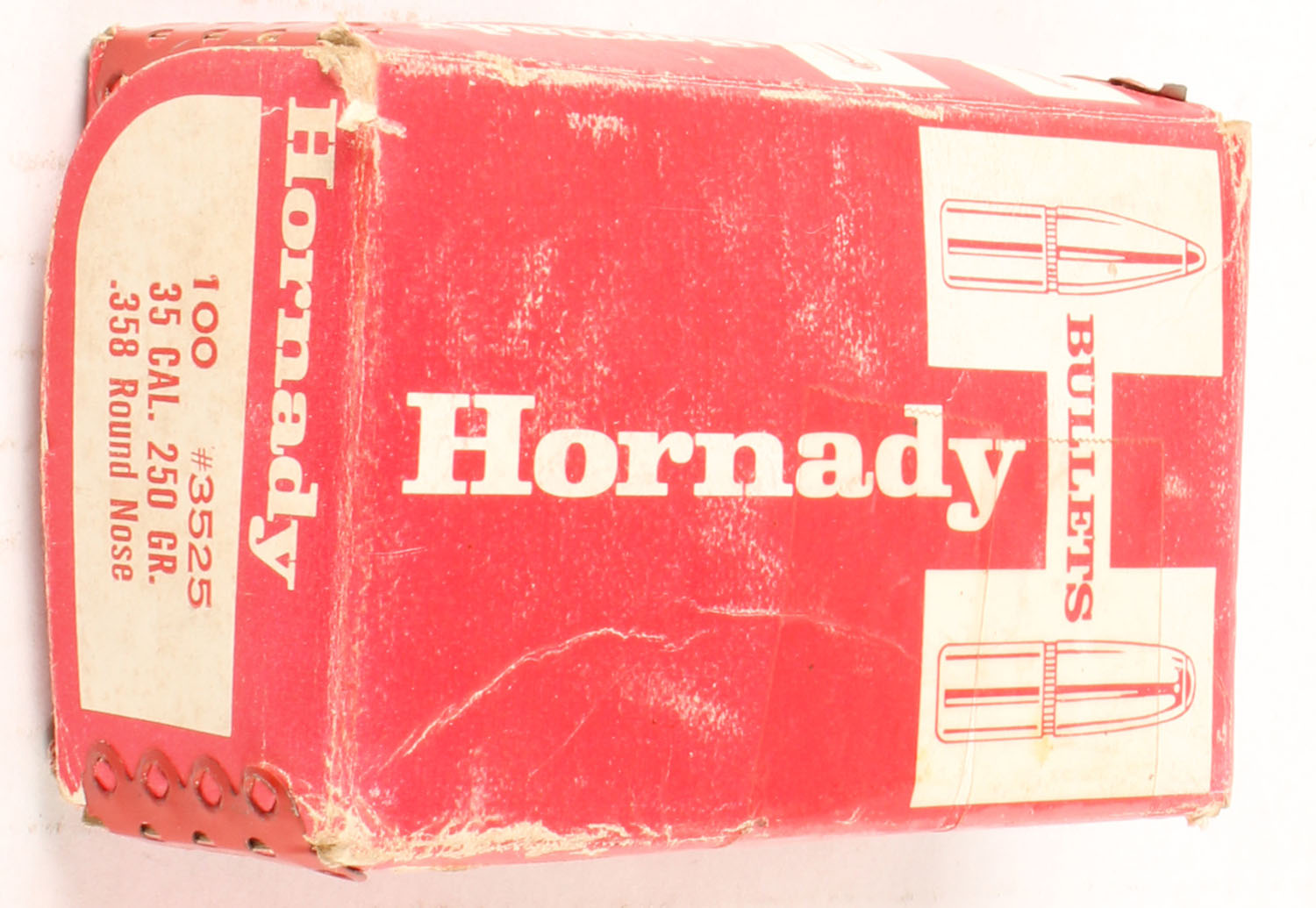 Hornady, .35 Cal., 250 Grain .358 Round Nose, Full, 1pc. Red box is solid with some scuffing, bullets are vey good. Grade: Very Good - Value: 10 to 40