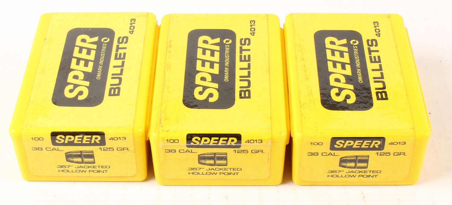 Speer, Lot of (3), .38 Cal.(.357''), 125 Grain Jacketed Hollow Point, Full, 1pc. Yellow boxes are solid, bullets are excellent. Grade: Excellent - Value: 20 to 60