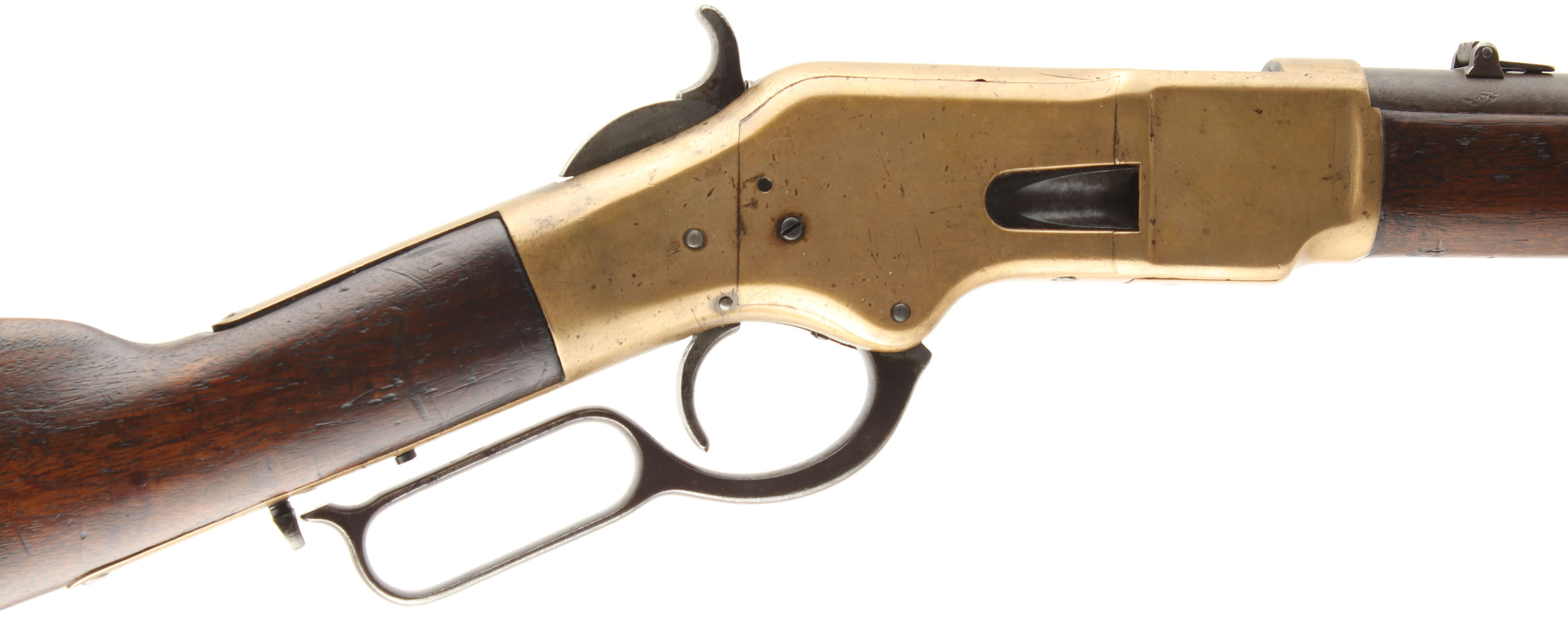 Winchester, Model 1866 Saddle Ring Carbine, 3rd variation, .44 Henry Cal., MFG. 1872, SN: 99251, Lever Action Carbine, 20'' Round barrel, Full mag. The original wood stocks are very good & solid, having been sanded & nicely refinished long ago. With time, it has sustained addition use wear & age since the refinish. The wood displays numerous minor to small scrapes, scratches & contusions, combining to give the carbine a very nice authentic & aged appearance. The metal is proud to the wood along the edges of the tangs, receiver & buttplate. There is an inlaid oblong shaped piece of matching wood that fills where an inlaid sling provision previously resided in the belly of the stock The upper left corner of the wrist has some matching wood fill building back up the area where a chip is missing from the corner of the tang & receiver. The toe of the stock sustained a split or break at some point & was glue repaired, with a bit of added fill evening out the contours. The forend has one larger gouge at the forend tip. Overall, the stocks maintain a very nice appearance. The metal has worn gun metal gray, with a very thin brown patina. The brass receiver & buttplate were likely cleaned at some point, but are developing a nice aged patina. There are Bore is very good, with cleaned roughness amongst strong rifling. The barrel carries the original flip-up rear sight, with 1,3 & 5 markings for 100, 300 & 500 YDS & a standard pinch blade barrel band front sight. The address atop the barrel is still very clear. Stock carries a brass flip-up trapdoor crescent buttplate. Staple mounted saddle ring. The SN is block stamped on the lower tang. Tight, smooth action & appears mechanically sound. This 1866 SRC has a used & strong period appearance, while maintaining good functionality.* Antique, No FFL Req. - Value: 3500 to 6000