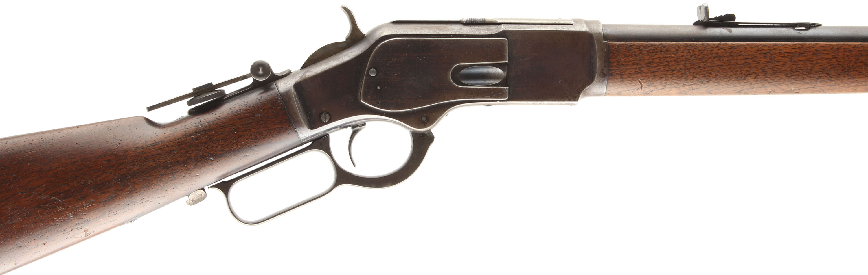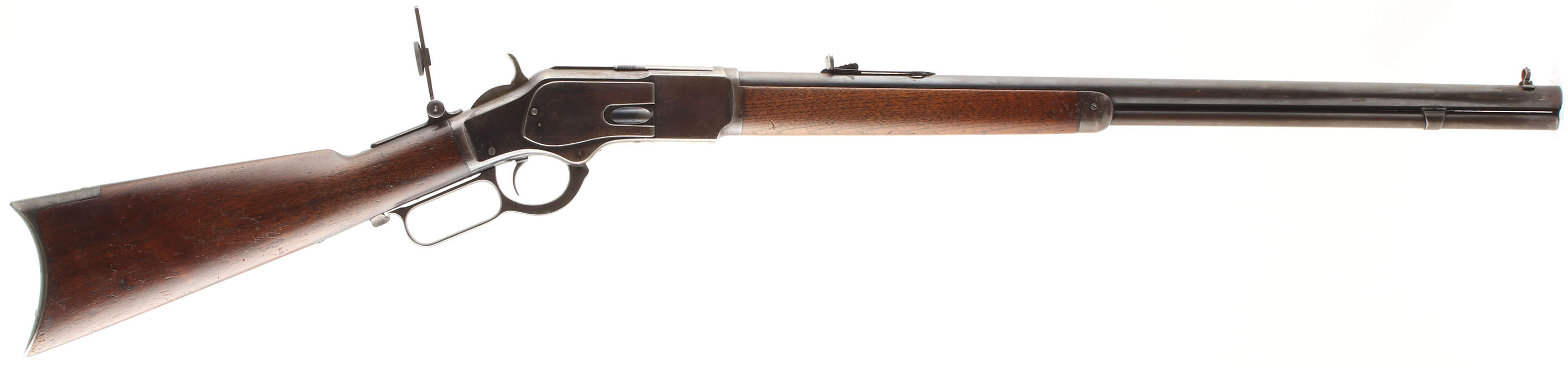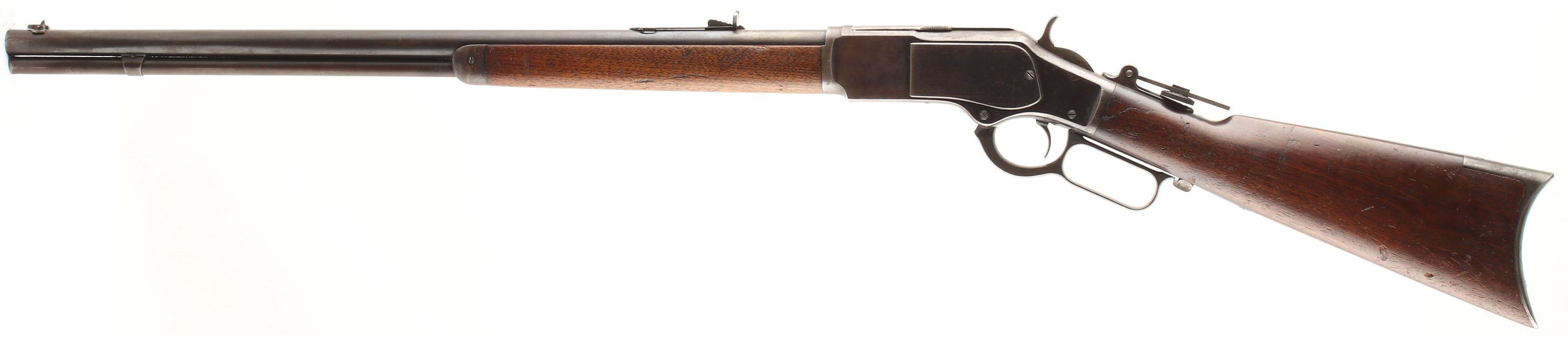 Winchester Model 1873, 3rd Variation, 32 WCF CAL., MFG: 1883, SN: 124091A, Lever Action Rifle, 24 1/4'' Round barrel, Full Mag. The original wood stocks are excellent & solid. The stocks have several minor scratches, scrapes & contusions to the very nice original finish on the stock. The forearm appears to have been cleaned some time ago, but not sanded, as it is a shade lighter than the receiver. The original metal blue finish has worn & faded to where there remains approximately 20% in the more protected areas of the receiver barrel & mag, with the balance worn gun metal gray & a thin brown patina. Some very muted outlines of case-colors remain on the case-hardened lever & hammer. Bore is excellent & bright. The receiver is fitted with a vernier large aperture flip-up tang sight, while the barrel carries the original adjustable rear & flip-up globe front sights. Buttstock carries a crescent metal buttplate. Plain trigger. A very nice & sharp appearing antique 1873 rifle. Antique, NO FFL Req. - Value: 2750 to 3500