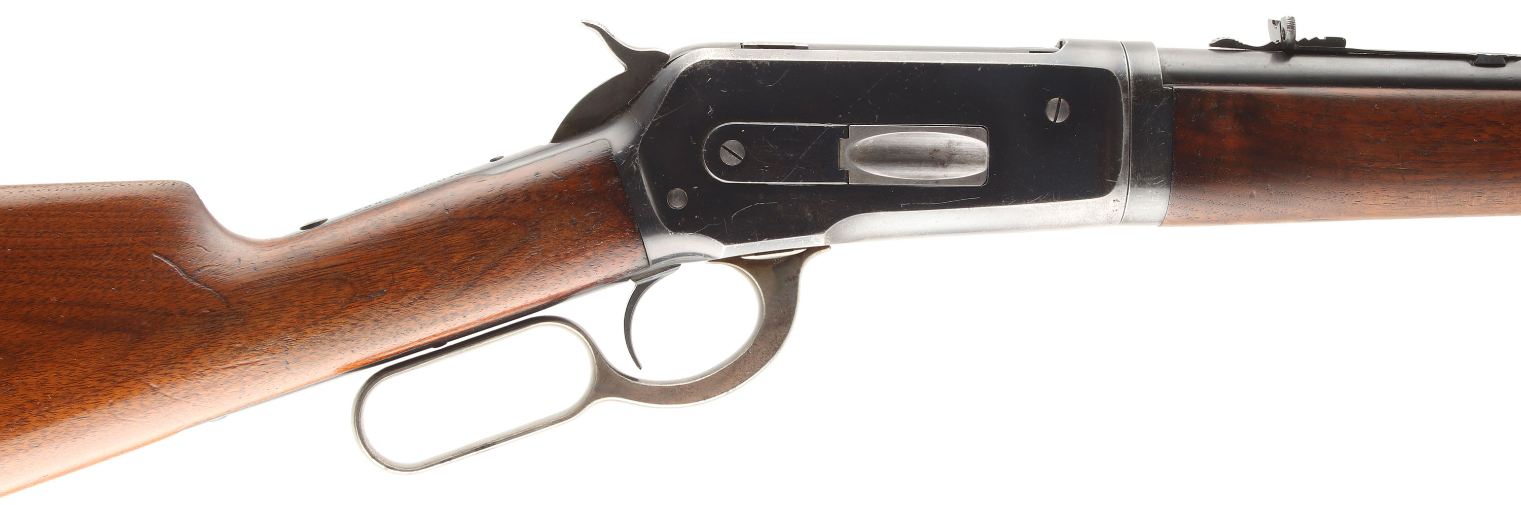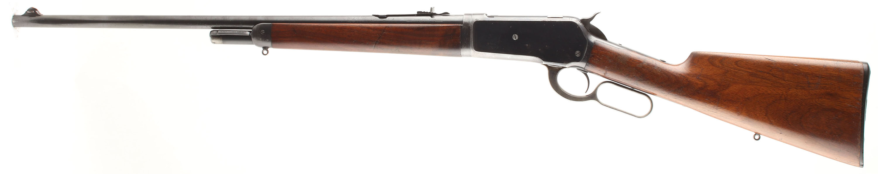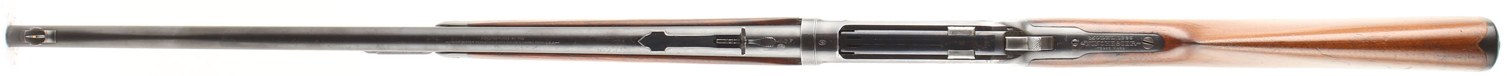 Winchester, Model 1886 TAKE-DOWN, 33 WCF, MFG. 1905, SN: 137474, Lever Action Rifle, 24'' Round barrel, 1/2 mag. The original straight grip stocks are excellent, retaining the majority of the original finish, with thinning at the carry points & minor handling marks, light scratches & contusions. The original metal blue finish 85% on the barrel, 80% on the receiver, with the lever & hammer being case-hardened & displaying muted case-colors. The sliding bolt retains a full 85% of its original bright blue. The barrel is fitted with an adjustable rear sight & a Lyman half moon blade & ivory bead front sight. Bore is excellent & bright. Stock carries a checkered widow's peak plastic shotgun buttplate, with sling eyelets in stock & forend cap. This rifle is an excellent example of an original & collectible 1886. FFL or C&R Req. - Value: 2750 to 4000
