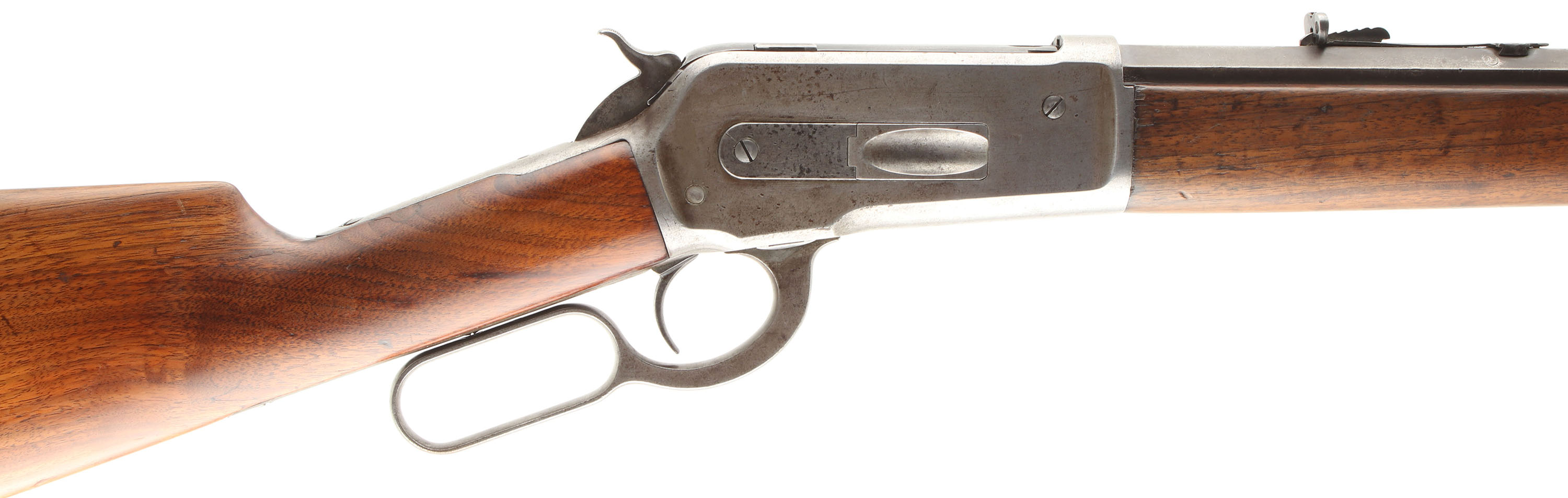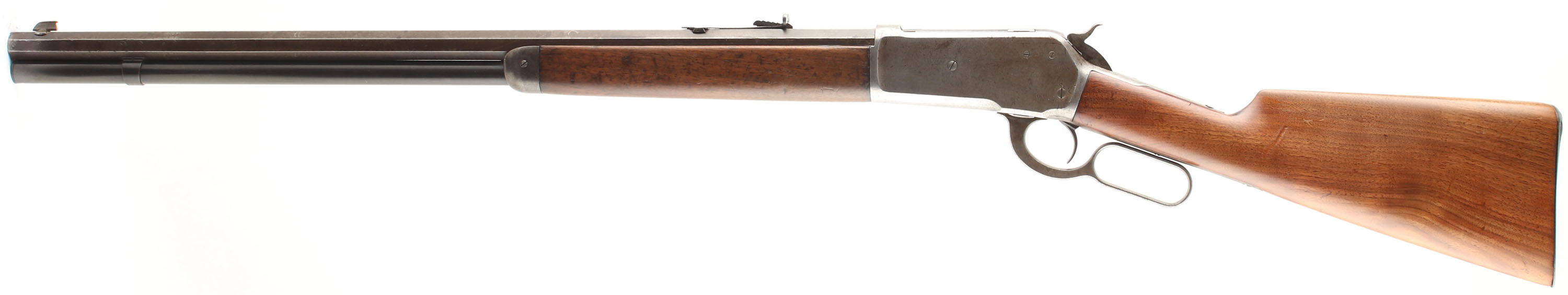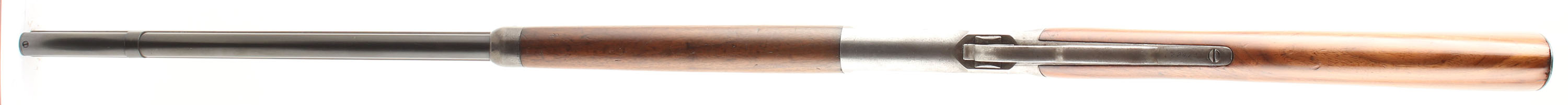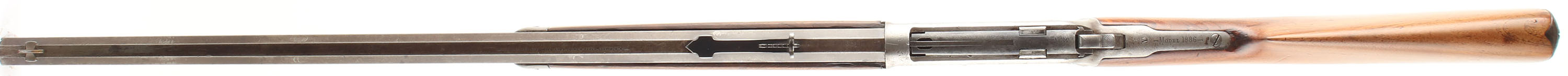 Winchester, Model 1886, 40-65 WCF, MFG. 1888, SN: 22478, Lever Action Rifle, 26'' Round barrel, Full mag. The straight grip stocks are good, with the stock having been sanded & refinished, with the wood remaining proud to the metal. The forend retains thing coverage of the original finish. The stocks both exhibit minor handling marks, scratches & contusions, with more found on the forend. There is a bit of edge chipping at the end of the upper tang of the receiver. The metal on the barrel has worn mostly gun metal gray, with a thin brown patina. The mag & mag retaining loop appear to be updated replacements carrying 90% blue. The case-hardened receiver, lever & hammer have all worn gun metal gray. The sliding bolt retains some thin remnants of the original blue. The barrel is fitted with an adjustable rear sight & elongated blade front sight. The upper left side of the receiver has two filler screws for possible mounting of side mounting of receiver sight. Bore is good & bright, but with numerous spots of scarring amongst strong rifling. Stock carries a checkered widow's peak shotgun style metal buttplate. Remains a solid antique case-hardened 1886 rifle. Antique, No FFL Req. - Value: 1250 to 2500