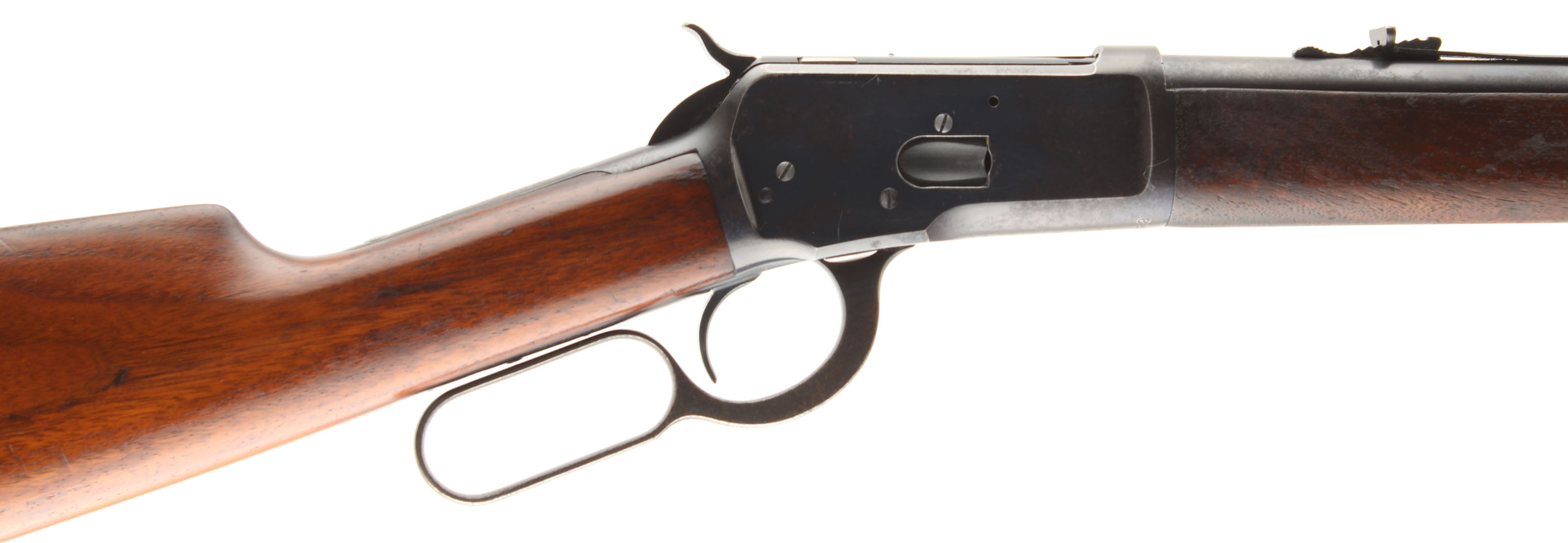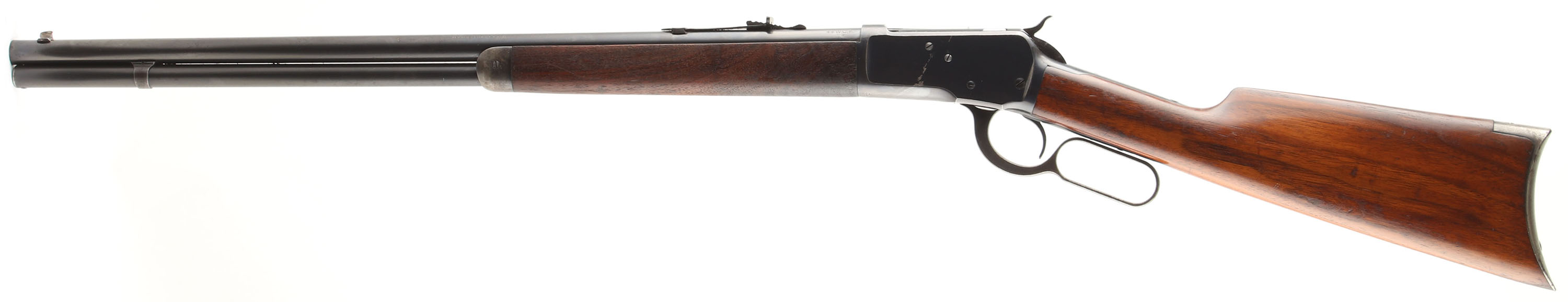 Winchester, Model 1892, CAL: 44-40 W.C.F., MFG: 1917, SN: 827702, Lever Action Rifle, 24 1/4'' Round Barrel, Full Mag. The original straight grip wood stocks are excellent, with several minor contusions & light scratches to the original finish, which is showing thinning lose at the wrist & forend grip areas. The original metal blue finish on the barrel rates 80%, 85% on the mag tube & 75% on the receiver, with loss due to speckled browning on right sides of the receiver & barrel. Bore is excellent & bright. The rifle is fitted with the original adjustable rear & pinched blade front sights. Buttstock carries the original crescent metal buttplate. This is an all original & desirable 44 WCF rifle. FFL or C&R Req. - Value: 2750 to 3500