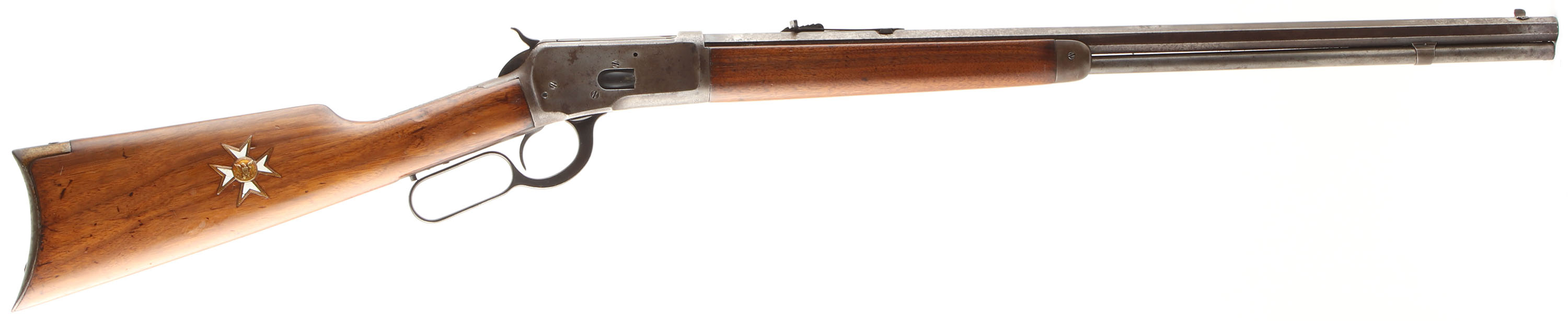 Winchester, Model 1892, marked 25-20 WCF, MFG: 1919, SN: 855378, Lever Action Rifle, 26 1/4'' Octagon barrel, Full mag. The original wood stocks are good & solid. The right side of stock exhibits an inlaid Maltese Cross metal with eagle pluribus shield, while the left side has an inlaid Chicago 1910 metal emblem. The stocks were sanded & refinished, likely at the time of the inlays, but still have remains of several minor scratches, scrapes & contusions. The metal finish has mostly worn to a gun metal gray, with a spotty thin brown patina & some areas of pitting or speckling. Bore is good, with cleaned roughness amongst solid rifling. The rifle is fitted with an adjustable rear sight & small blade front sight. The stock carries a smooth crescent metal buttplate. Tight smooth action. The rifle has lots of character & lots of shooting life left in the old rifle. FFL or C&R Req. - Value: 600 to 1000