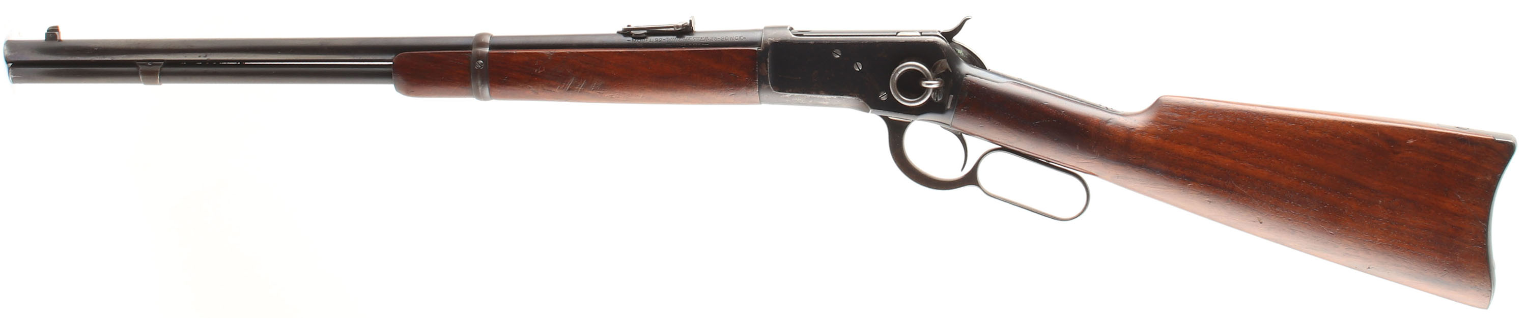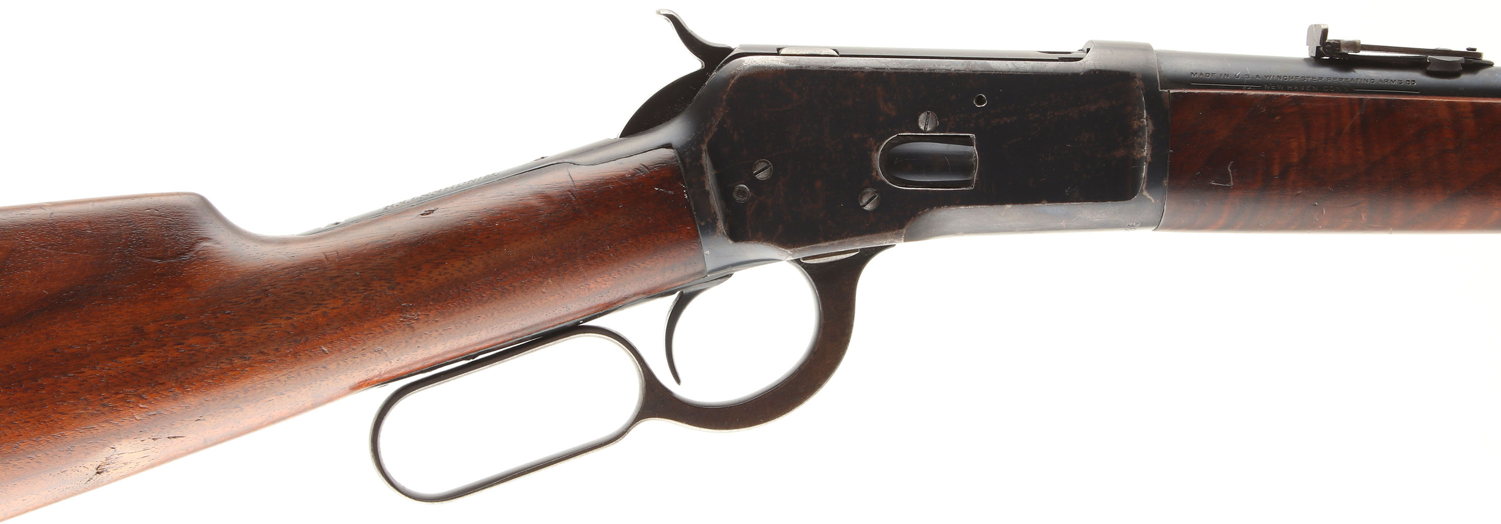 Winchester Model 92 SRC, CAL: 25-20 WCF, MFG: 1926, SN: 968247, Lever Action Rifle, 20'' round barrel, Full mag. The original straight grip wood stocks are excellent, with a number of minor to small contusions & light scratches to the excellent original finish. There is one dime sized contusion to the belly of the stock. The original metal blue finish rates 85% on the barrel & mag tube, 75% bright blue remaining on the receiver, with loss on receiver due to ''Winchester flaking'' loss on sides toning to a brown patina. Bore is excellent. Barrel fitted with the correct carbine adjustable flip-up ladder rear & standard carbine box front sights. Smooth metal carbine buttplate. Smooth tight action. A very sharp looking & original SRC 92. FFL or C&R Req. - Value: 2000 to 2750