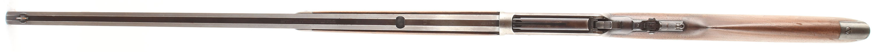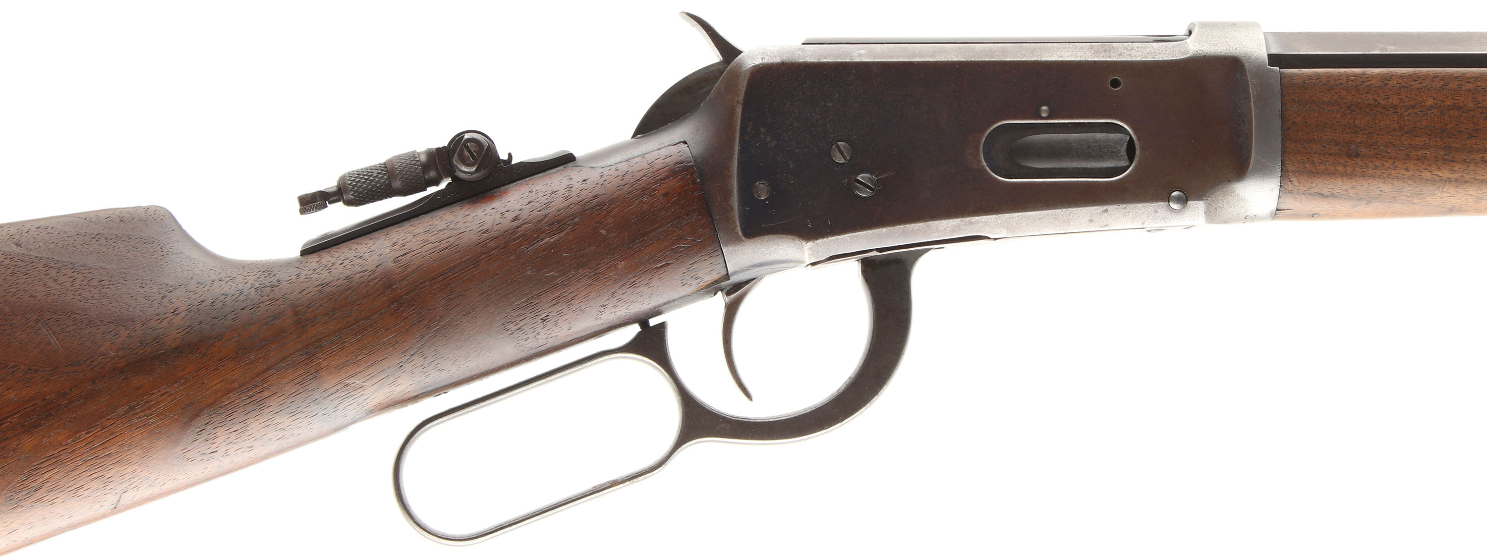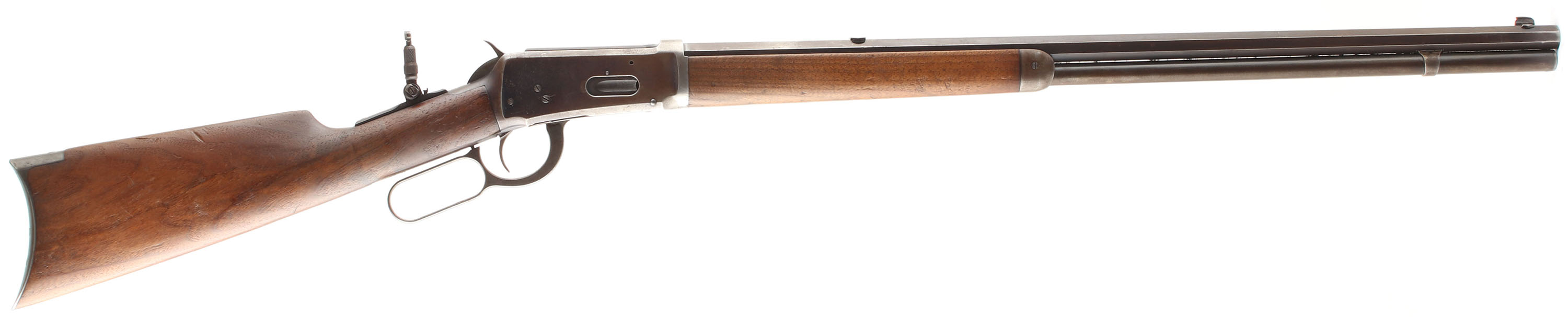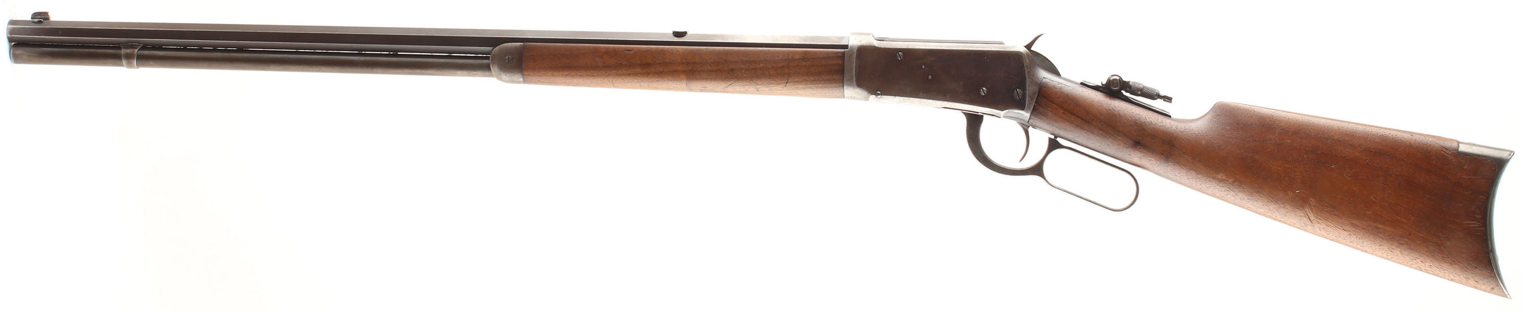 Winchester, Model 1894, marked 32-40, MFG: 1906, SN: 303072, Lever Action Rifle, 26'' Octagon Barrel, Full mag. The original wood stocks are excellent, with several minor to small scuffs, scratches & contusions to the wood & thinning original finish. There is a small corner chip at the lower fight corner of the wrist. The original factory metal blue finish rates 40% on barrel, 40% on mag tube, while the receiver retains only 10% of original blue, with area of loss toning to a very thin brown patina. Bore is very good. The rifle is fitted with a Marble's flip-up tang sight, while the barrel carries a blank filled rear dovetail & a Marble Sheard elongated blade front sight. Original crescent metal buttplate. Tight smooth action. An very nice original condition 1894 rifle. FFL or C&R Req. - Value: 1750 to 2500