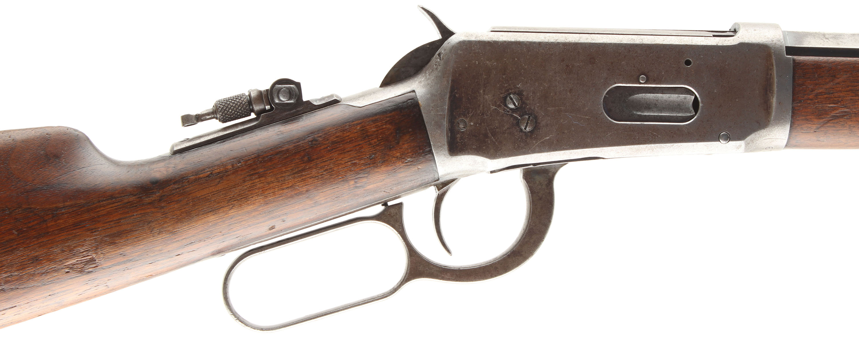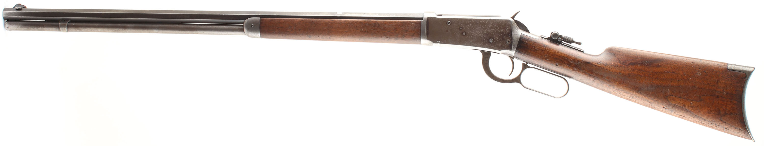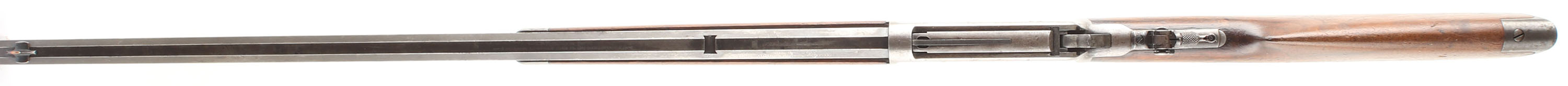 Winchester, Model 1894, marked 30 WCF (30-30), MFG: 1899, SN: 67850, Lever Action Rifle, 26'' Octagon Barrel, Full mag. The original wood stocks are very good, appearing to have been cleaned & oils added long ago, with several minor to small scuffs, scratches & contusions to the wood & thinning finish. The toe of the stock is a bit short of the buttplate end, in part due to wear & chipping, along with some natural shrinkage. The original factory metal blue finish rates 30% on barrel, 20% on mag tube, while the receiver has worn gun metal gray, with a very thin brown patina. Bore is very good. The rifle is fitted with a Lyman flip-up tang sight, while the barrel carries an open rear dovetail & a King elongated blade front sight. Original crescent metal buttplate. Tight smooth action. A solid original 1894 rifle. FFL or C&R Req. - Value: 1500 to 2250