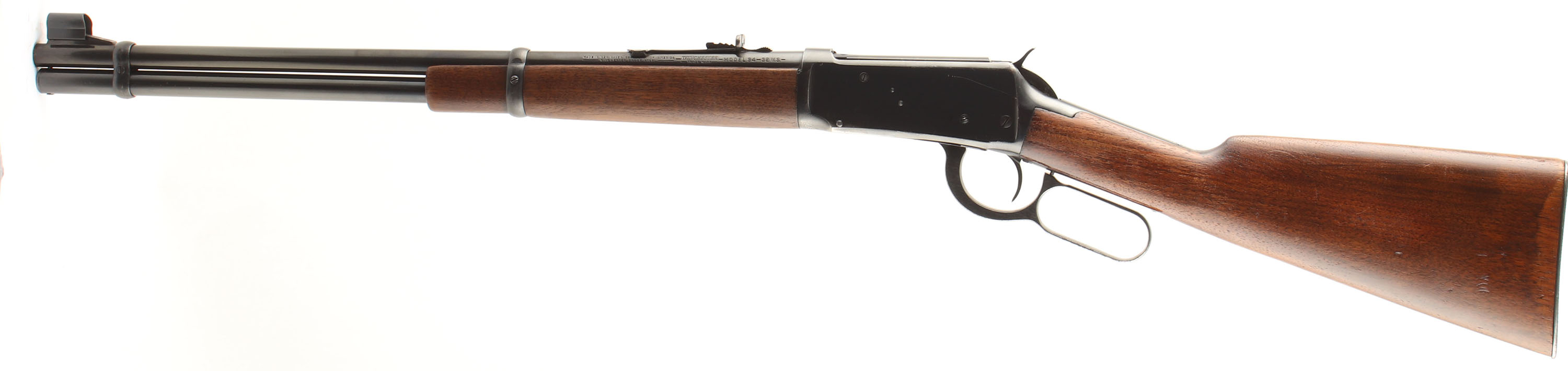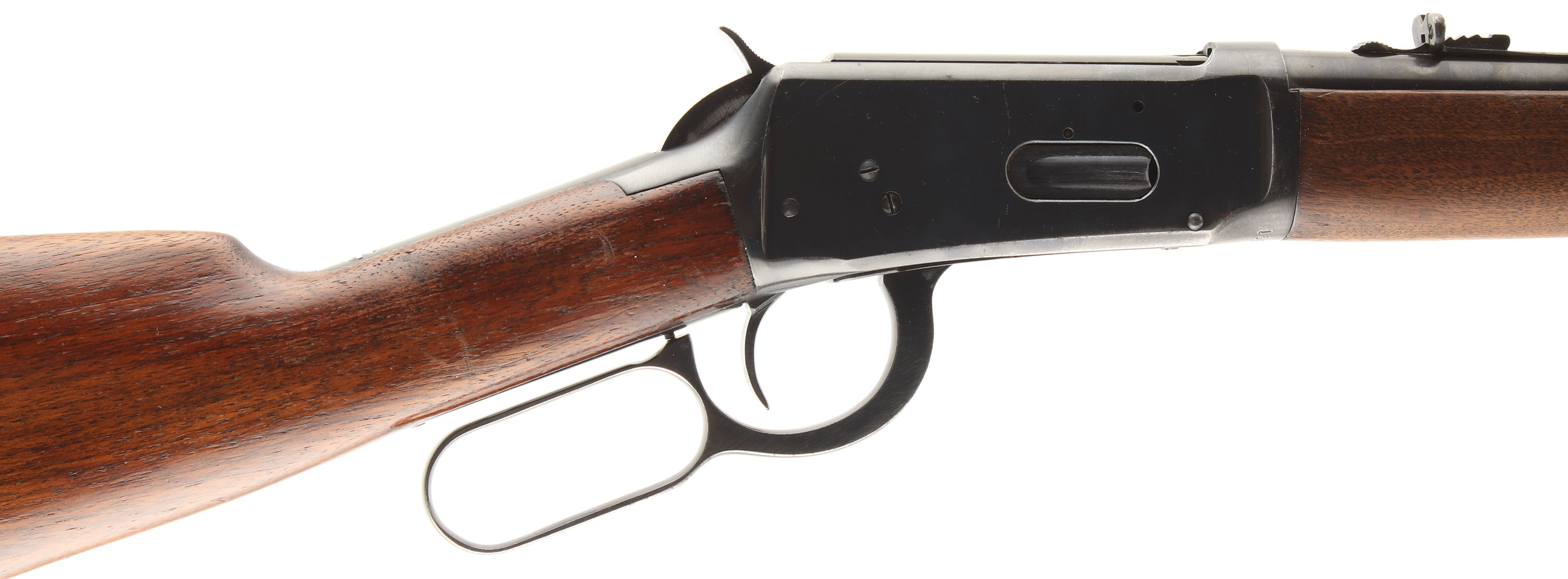 Winchester, Model 94 Carbine, CAL: 32 W.S., MFG: 1949, SN: 1592987, Lever Action Carbine, 20'' Round barrel, Full mag. The straight grip wood stocks are excellent & solid, with few minor handling marks to the original finish. The stock appears to carry an added layer of finish, which looks to have been needed after the stock was thinned some at the buttend to accommodate a narrower buttplate. The original metal blue finish rates 95% on the barre & mag tube, 90% on the receiver, with loss mainly located on the belly of the receiver. Bore is excellent & bright. The barrel holds an adjustable rear sight & hooded ramp front sight. Stock carries a checkered metal shotgun style buttplate. Smooth tight action. Overall excellent & mostly original carbine. FFL or C&R Req. - Value: 1000 to 1500