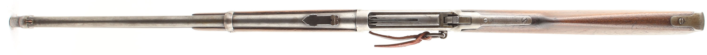 Winchester, Model 1894 SRC, CAL: 30 WCF (30-30), MFG: 1904, SN: 213525, Lever Action Carbine, 20'' Round barrel, Full mag. The straight grip wood stocks are very good & solid, with several tiny to minor scrapes, scratches & contusions to the stocks & the original finish. There are a couple of small missing chips at the top shoulders of the wrist & the receiver, one on each side. There is also a 2'' crack at the forend tip. The metal blue finish has worn mostly guns metal gray, with 20% remaining on the barrel, 30% on the mag tube & the receiver fully worn gun metal gray, with a very thin brown patina. Bore is good, with lots of cleaned roughness amongst strong rifling. The barrel is fitted with a three leaf folding rear sight & carbine box front sight. Stock carries a smooth metal carbine buttplate. Original saddle ring, with leather lash. Smooth tight action. A solid & quality SRC shooter in the popular 30 WCF. FFL or C&R Req. - Value: 800 to 1500