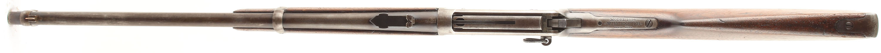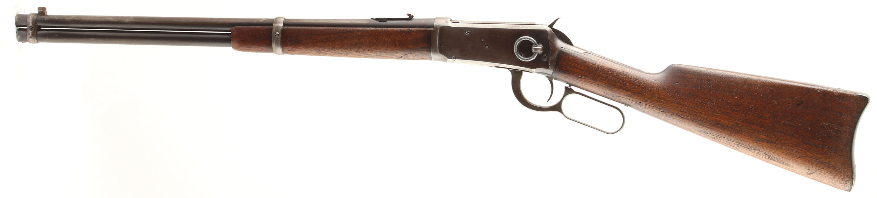 Winchester, Model 1894 SRC, CAL: 32-40, MFG: 1904, SN: 253423, Lever Action Carbine, 20'' Round barrel, Full mag. The straight grip wood stocks are very good & solid, with several tiny to minor scrapes, scratches & contusions to the stocks. The stocks appear to have been cleaned & possibly lightly sanded & refinished a long time ago, but have an authentic appearance. The original metal blue finish has worn mostly gun metal gray, with 20% remaining on the barrel, 30% on the mag tube & the receiver fully worn gun metal gray, with a very thin brown patina. There are three punch dot initial stamped into the right edge of the bell of the receiver. Bore is good, but with lots of cleaned roughness amongst strong rifling. There is also two rings in the barrel at 3.5'' & 5'' from the muzzle, but without too much visual evidence of bulges on the exterior. The barrel is fitted with a two leaf folding rear sight & carbine box front sight. Stock carries a smooth metal carbine buttplate. Saddle ring. Smooth tight action. A nice authentic appearance on this SRC shooter in the collectible 32-40 caliber. FFL or C&R Req. - Value: 500 to 1000