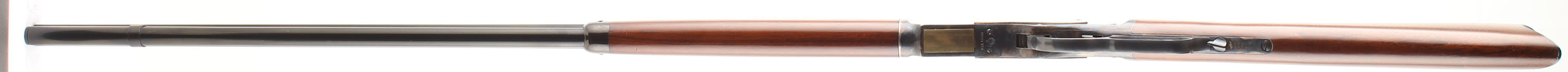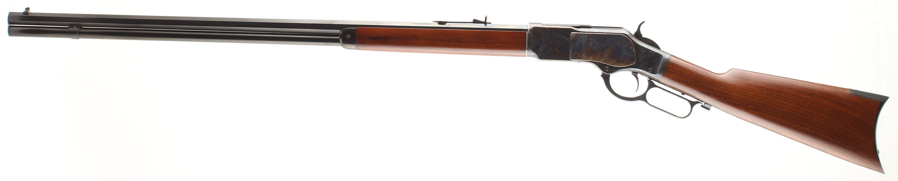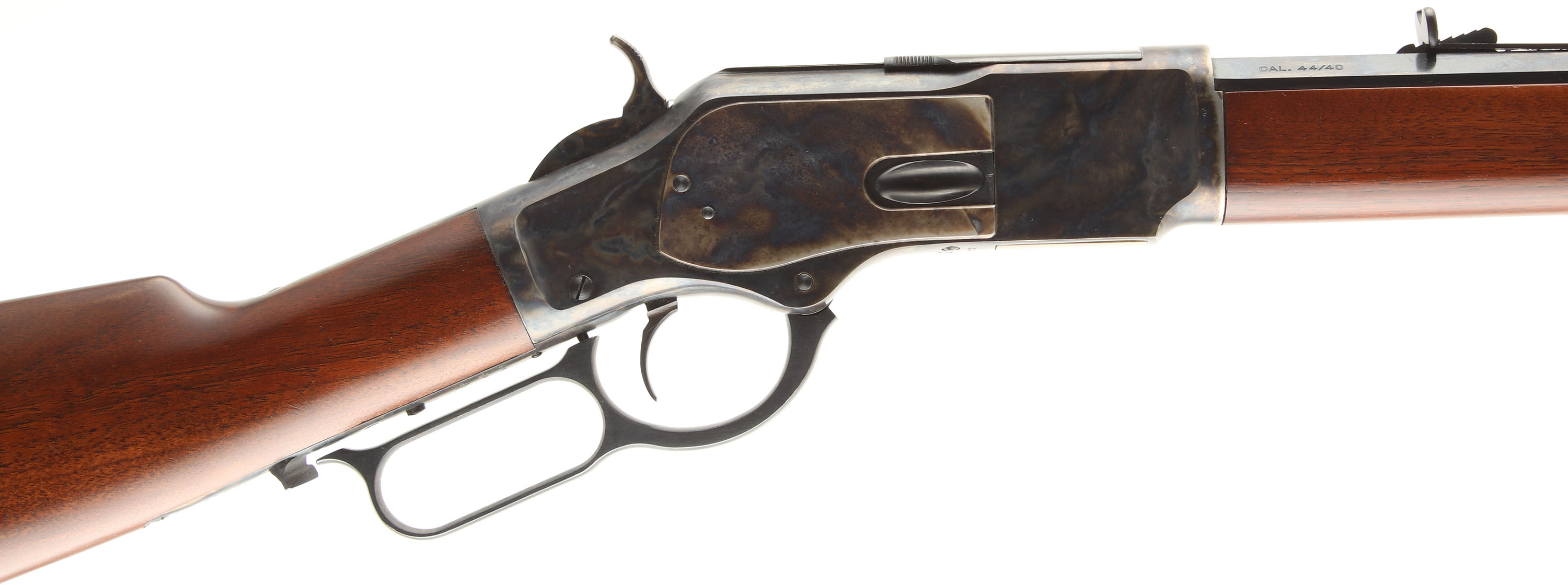 Uberti, Model 1873 Rifle, CAL: 44-40, MFG: Modern, SN: 55517, Lever Action Rifle, 30'' Octagon barrel, Full mag. The original straight grip wood stocks are excellent, displaying virtually no handling marks the excellent original finish. The high polished blue finish on the barrel & tube rates 99%, excellent. The receiver displays vivid case-colors. Bore is excellent, near mint. The barrel carries an adjustable rear & small blade front sight. Stock carries a crescent metal buttplate. A fantastic & basically new reproduction of an American classic. FFL Req. - Value: 1200 to 1800