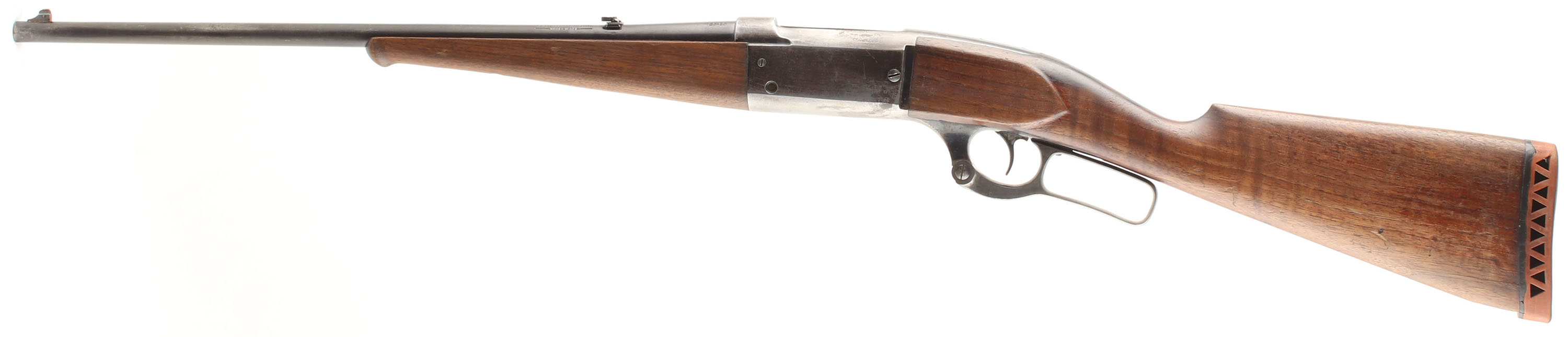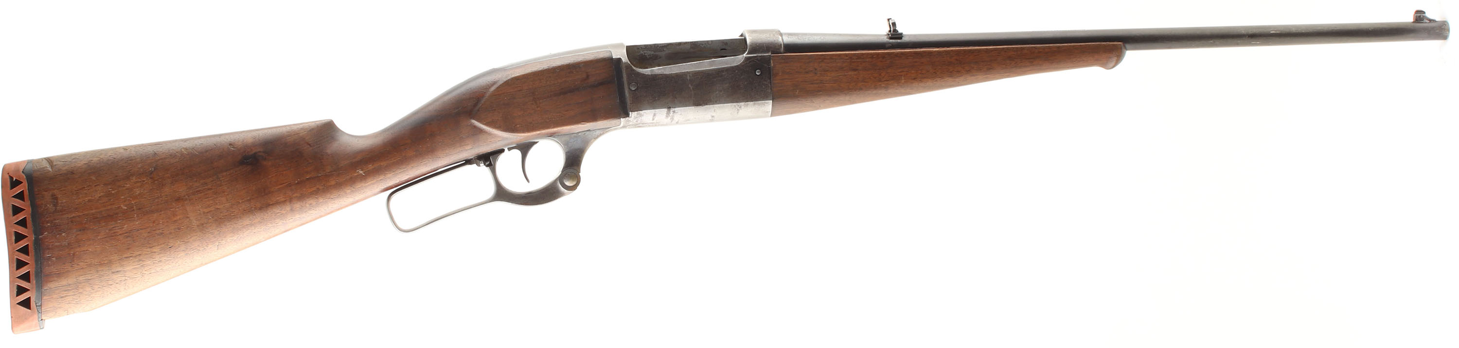 Savage, Model 1899, CAL: 30-30, MFG: 1907, SN: 76885, Lever Action Rifle, 20'' Tapered barrel. The original straight grip wood stock & forend are good & solid. The stock has been cut & there is a large missing chip from a toe break. There are several minor contusions & scrapes to the wood & nearly all the original finish has worn from use. The metal blue finish rates 50% on the barrel, while the receiver & lever have worn mostly gun metal gray, with remnants of original blue in the more protected areas. The internals of the lever display muted case-coloring. Bore is good & bright, but with some cleaned roughness amongst strong rifling. The barrel holds a flip rear sight & block elevated blade front sight. Round counter on left side of receiver. Stock carries a vintage Ranger kick pad that was a garage installation & is likewise also broken at the toe. FFL or C&R Req. - Value: 400 to 600