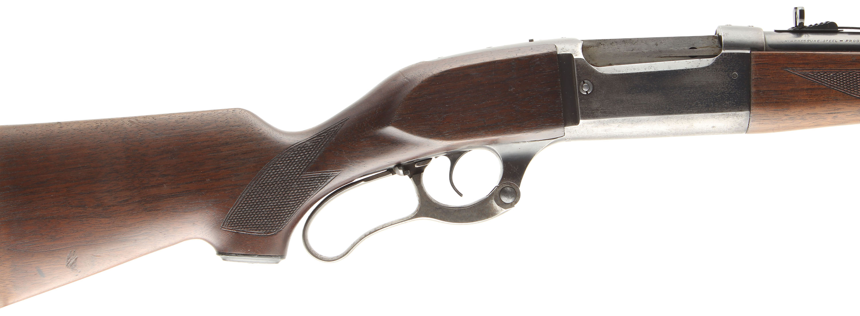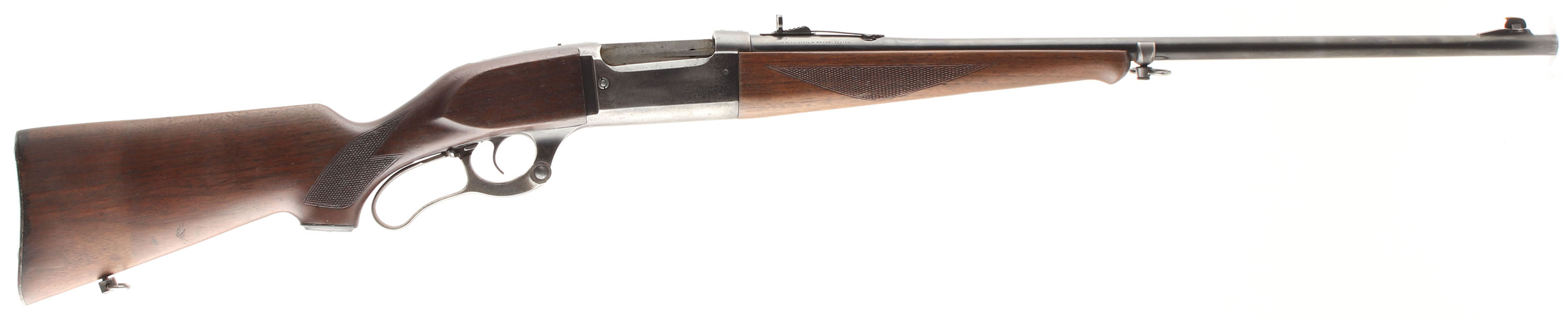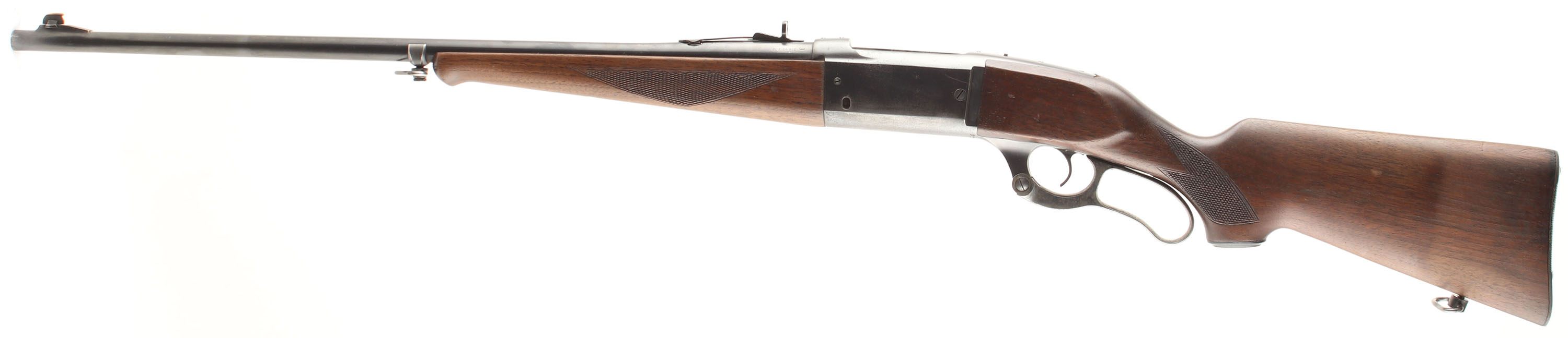 Savage, Model 99, CAL: 300 SAV, MFG: 1951, SN: 596615, Lever Action Rifle, 24'' Tapered round barrel. The original checkered & capped pistol grip wood stocks are good, however there are two 4'' stress cracks at the top of the wrist & two 1'' cracks at the bottom of the wrist. There are several minor to small scratches & contusions to the original finish. The original metal blue finish on the barrel rates 60%, due to density loss, 25% on the receive. The case-hardened lever retains some muted case-colors. Bore is excellent & bright. The receiver has the two screws filled holes for tang sight mounting & four screw filled holes on the top of receiver for possible scope mounting. The barrel carries an adjustable rear & the original ramp elevated blade front sight. The stock carries the original grooved metal buttplate. Sling loops. FFL or C&R Req. - Value: 400 to 800