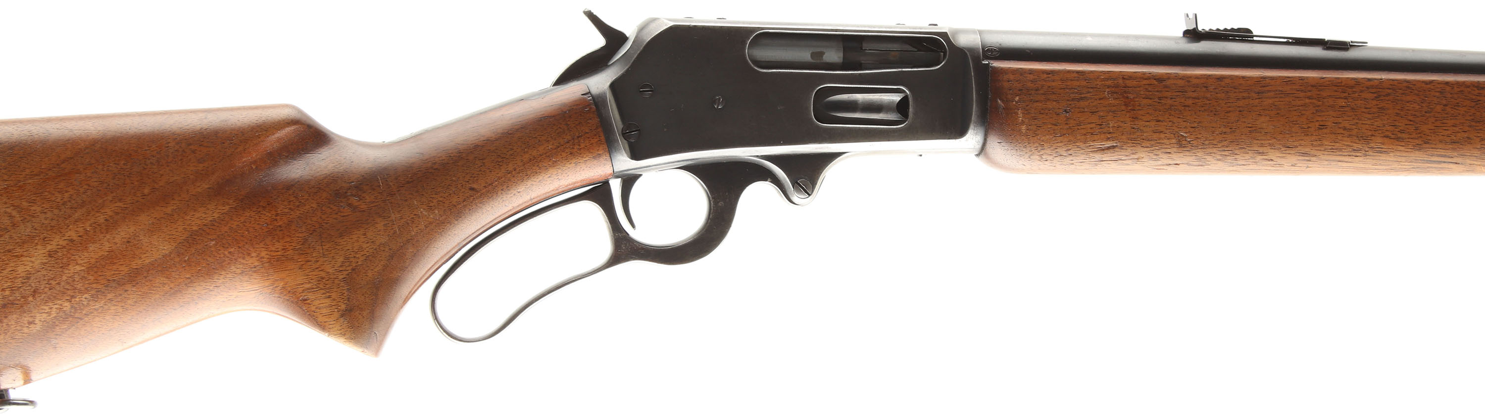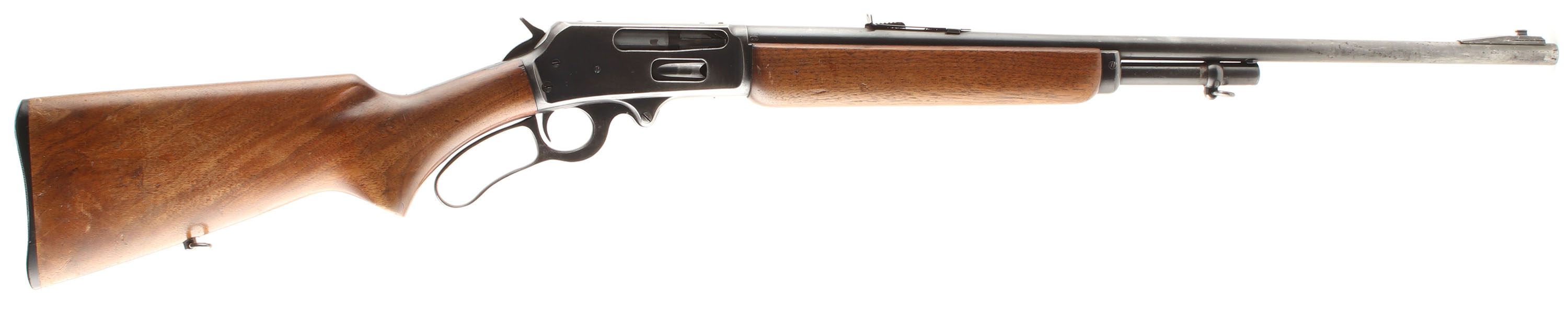 Marlin, Model 336-A, CAL: 30-30, MFG: 1954, SN:G10761, Lever Action Rifle, 24'' Round barrel, Full mag. The smooth flat pistol grip wood stocks are excellent, with several minor handling marks, light scratches & contusions to the original finish, which is thinning some from use. The metal blue finish rates 50% overall. Bore is excellent & bright. The barrel has an adjustable rear & a ramped blade front sights. Stock carries a Marlin checkered plastic buttplate. Sling loops. A quality lever action hunting rifle. FFL or C&R Req. - Value: 400 to 800