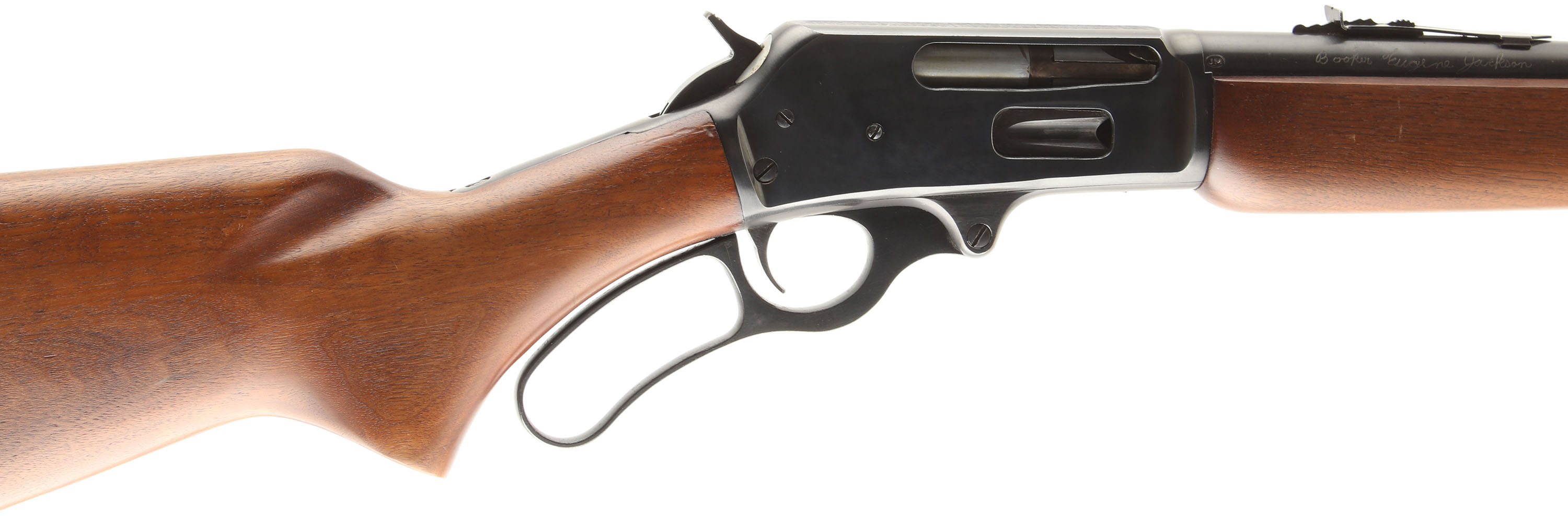 Marlin, Model 336 SC SPORTING CARBINE, CAL: 30-30, MFG: 1948-63, SN: H31371, Lever Action Rifle, 20'' Round barrel, 2/3 mag. The smooth flat pistol grip wood stocks are excellent, with a few minor handling marks to the excellent original finish. The original metal blue finish rates 95% overall. Bore is excellent & bright. The barrel has an adjustable rear & a ramped blade front sights. The right side of the barrel has the name ''Booker Eugene Jackson'' electric penciled on it. Stock carries a Marlin checkered plastic buttplate. Trademark Bullseye in belly of the stock. An overall excellent & quality vintage lever. FFL or C&R Req. - Value: 600 to 1000