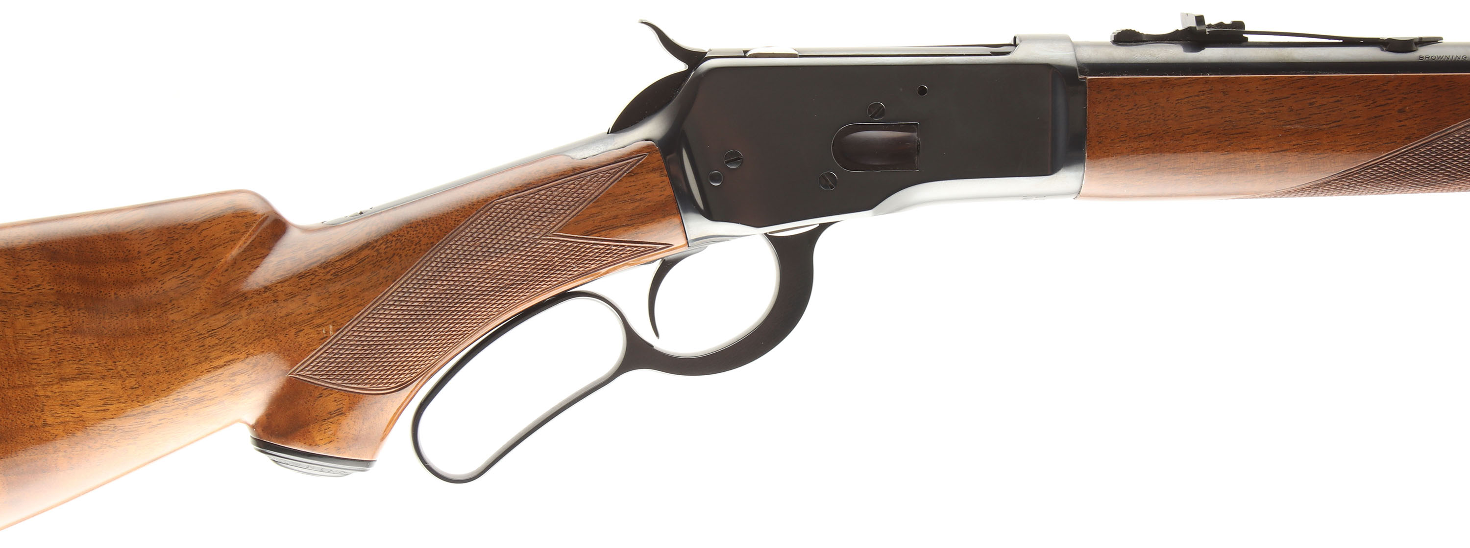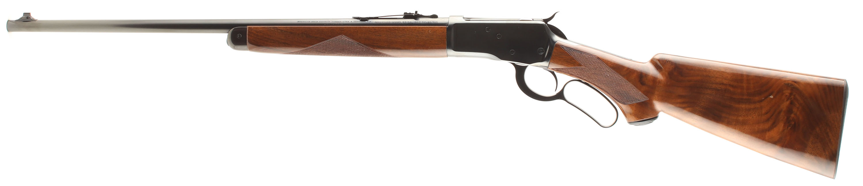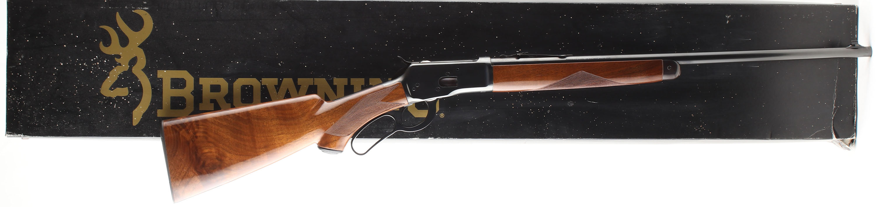 BOXED Browning, Model 53, .32-20 Cal., MFG. 1990, SN: 10040NM3F7, Lever Action Rifle, 22'' Round barrel, The original checkered & capped pistol grip wood stock is excellent, with only a couple of tiny storage or handling marks to the excellent high gloss finish. There is one small 1/8'' finish level nick in the finish on the left side of stock. Beautiful grain pattern to the wood. The original metal blue finish rates 99%, Bore is excellent, Factory front & rear sights. Serrated metal buttplate. Come in the original SN matching box, with booklet. Nearly NIB. 1 of 1400 produced, with just 5000 of those being in 32-20 caliber. FFL Req. - Value: 1000 to 1500
