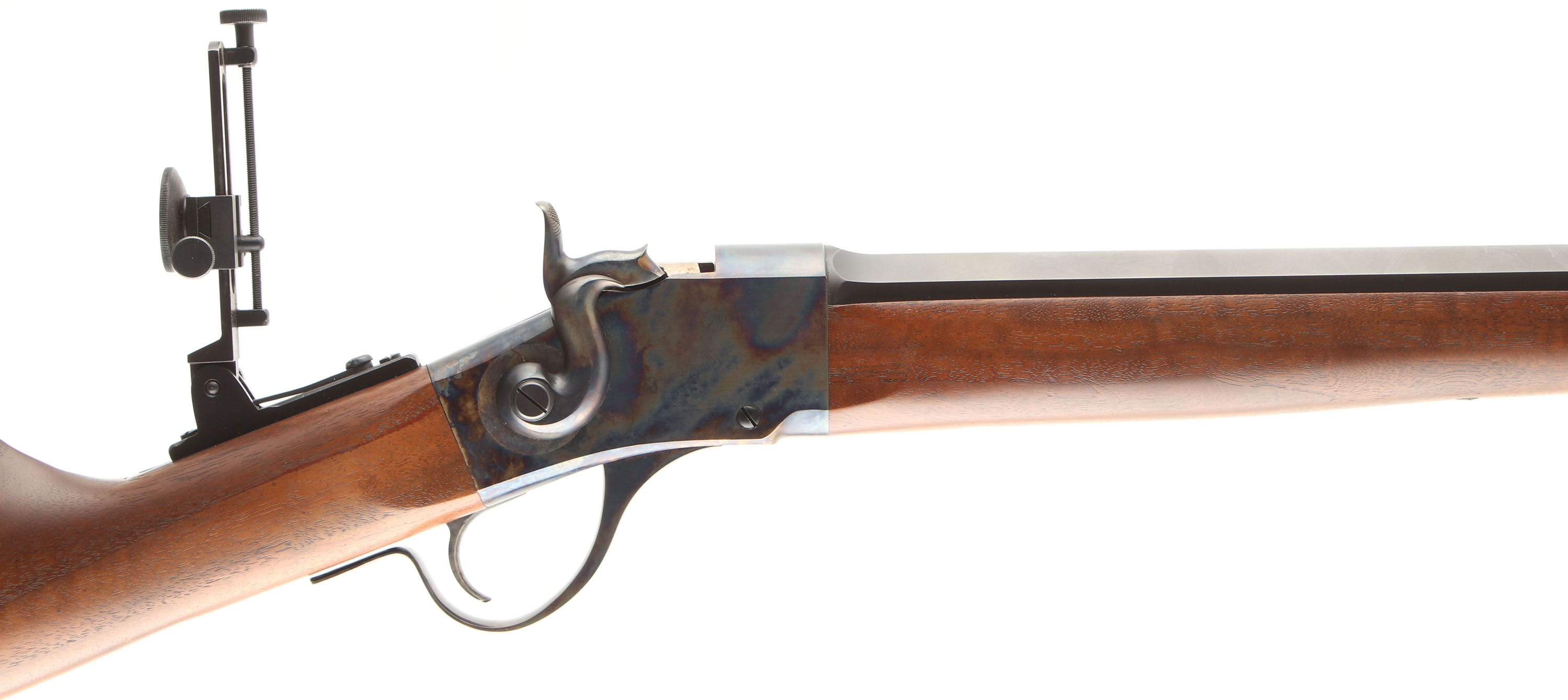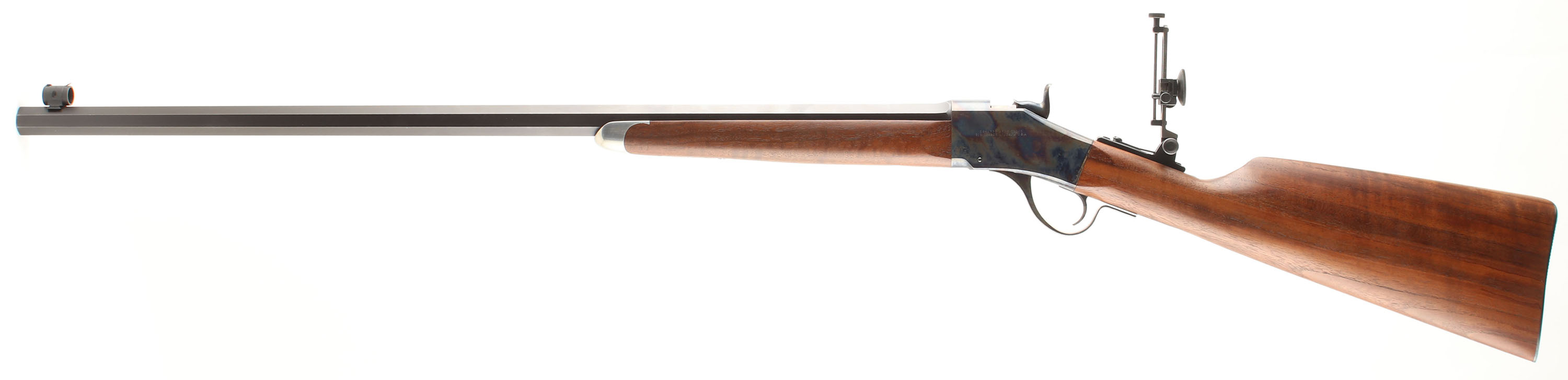 C. Sharps Arms Co,, Model 1875 Sharps Old Reliable, CAL. Marking: 40 2 1/2, MFG: Modern, SN: 31619, Falling Block Shot Rifle, 30'' Octagon barrel. Left side of receiver marked ''C. Sharps Arms Co. INC. Big Timber. Montana. U.S.A..'' The original smooth straight grip walnut stocks are excellent, displaying very few minor handling marks or light contusions to the excellent original finish. Hartford style silver forend cap. The original metal black finish on the barrel rates 100%. The case-hardened receiver is excellent displaying vivid case-colors. Bore is excellent & bright. The receiver carries a Lee Shaver Soule Type Sharps long range, large disk, tang sight, while the barrel carries no rear sight provision & a globe & post front sight. Buttstock carries a Bridgeport (shotgun style), widows peak, checkered metal buttplate. Nearly new, excellent original overall condition, as special ordered. FFL Req - Value: 2000 to 2500