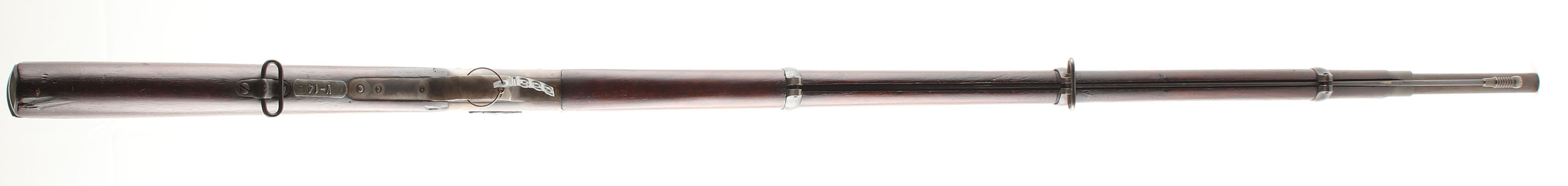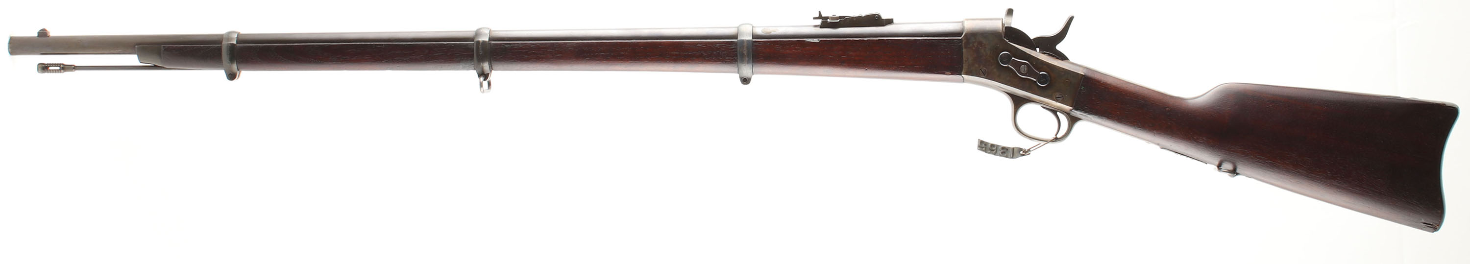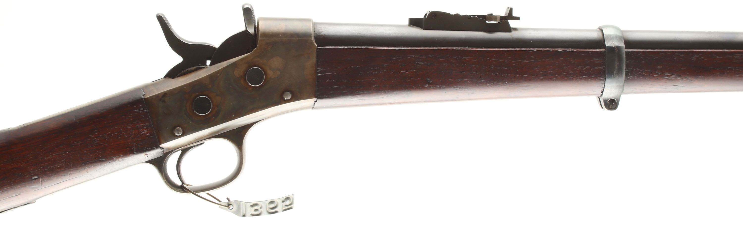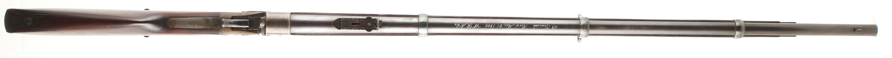 CONDITION: The two-piece, straight wrist walnut stock is excellent with only superficial nicks & dings from handling & storage (there is one larger ding at the toe). The bottom of the wrist has the Velocity data plate added on by the lab. The receiver retains 98% of its beautiful case-hardened finish with the barrel retaining 95% of its coverage with spots of thinning & starting to tone brown & actually rates 90%. The upper tang is marked with the three line 'REMINGTON'' address & patents ending in ''1874''. The top of the barrel, between the rear & middle bands is engraved ''43 Spanish Rec'd Mar. 21 1900. W.R.A.Co.''. All three barrel bands marked ''U'' on the left side. The bore is excellent. It's bright & mirrorlike with little to no visible wear. The barrel holds a small barleycorn front sight with a stepped base/ladder V-notch rear sight marked 2 to 4 on the base & the ladder is unmarked. The stock carries a steel buttplate, toned to a mix of thinned blue, gun metal gray & brown patina. The rifle has both factory sling loops,& has the cleaning/clearing rod. Mechanical function appears solid. A unique example of one of Winchester buy a rifle from one of their biggest rivals Remington for testing to make sure they were making the superior product. Antique, No FFL Req - Value: 1500 to 3000