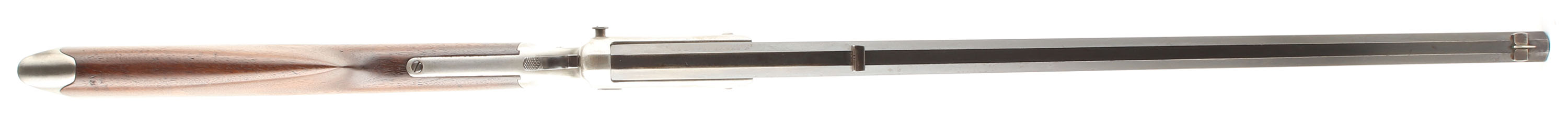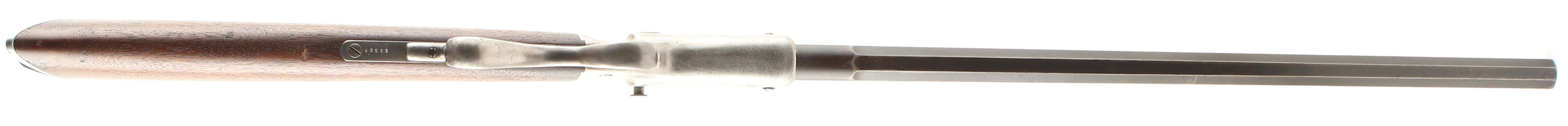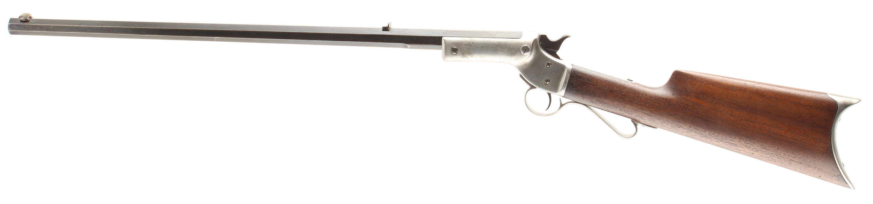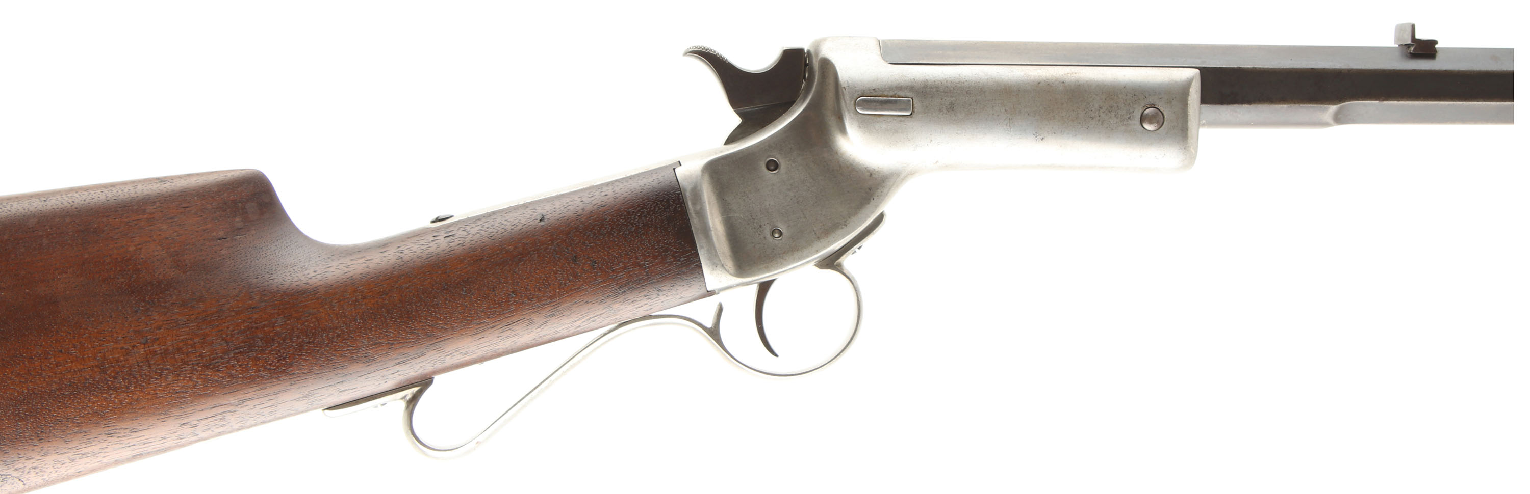 J. Stevens A & T. Co., Model No. 1 Tip-Up Rifle, Cal: 25 RF, MFG: 1888-95, SN: 26327, Single shot, tip open, 23 3/4'' Octagon barrel, The original straight grip wood stock is excellent, with very few light handling marks to the original finish. This model produced without a forend. Left side of barrel is marked ''J. STEVENS A. & T. CO. CHICOPEE FALLS.MASS. PAT.SEPT.6.1864''. The metal blue finish to the barrel rates 60%, toning to a brown patina as it thins. The receiver is silver. Scalloped trigger guard. The barrel carries a fixed rear & a elongated blade front sight. Bore is good, with areas of roughness amongst strong rifling. Stock carries a crescent metal buttplate. This is a nice looking representative example of the Stevens tip-up rifle. Antique, No FFL Req - Value: 600 to 900