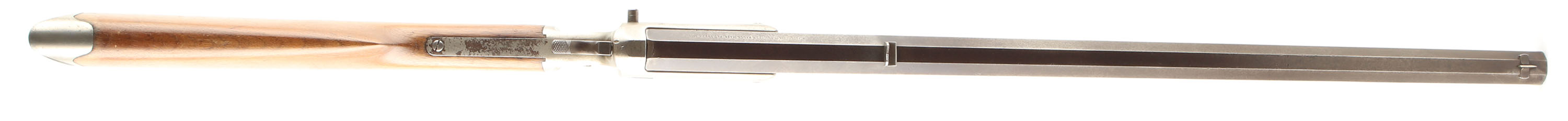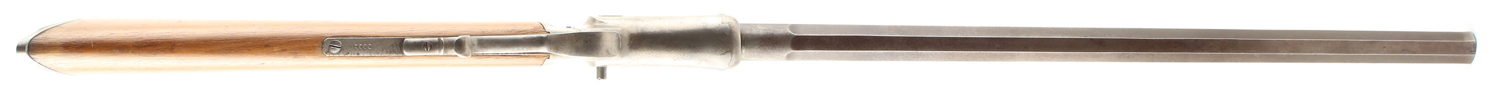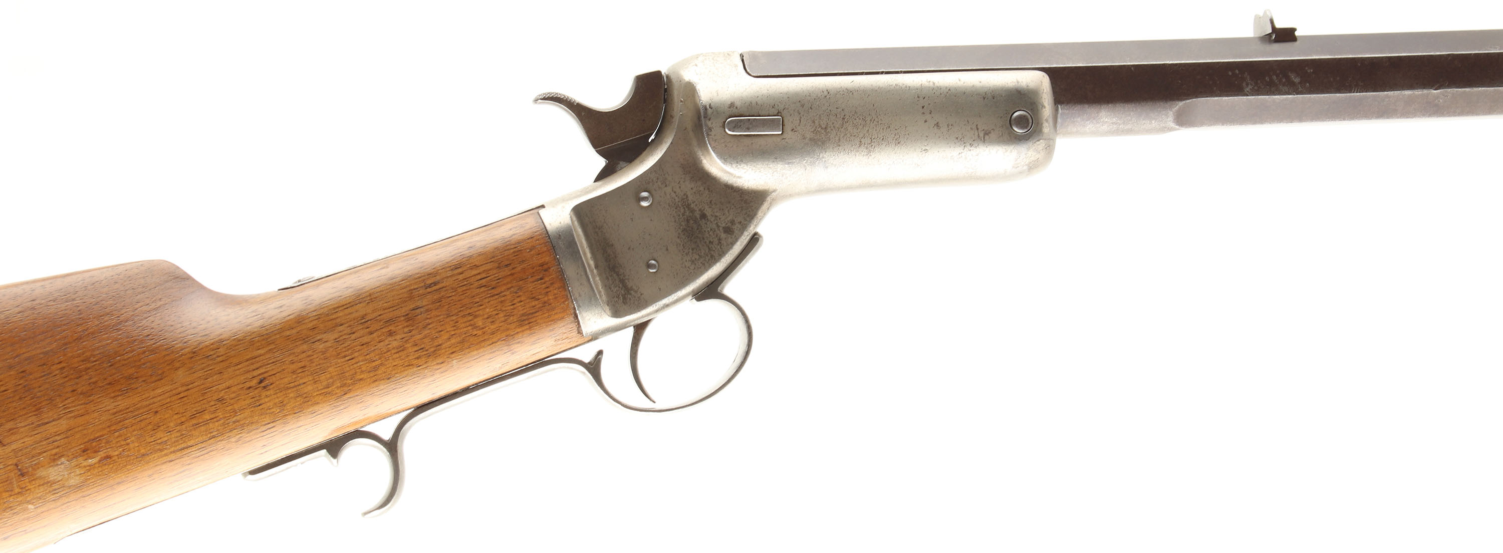 J. Stevens & Co., Model No. 1 Tip-Up Rifle, Cal: 32 RF, MFG: 1870's-88, SN: 5389, Single shot, tip open, 24'' Octagon barrel, The original straight grip wood stock is very good, having been sanded & refinished. There are with several light scratches, scrapes & contusions remaining, & the finish shows thinning in areas. This model produced without a forend. Left side of barrel is marked ''J. STEVENS & CO. CHICOPEE FALLS.MASS. PAT.SEPT.6.1864''. The metal blue finish to the barrel has worn & toned to an even thin brown patina. There are numerous small chatter marks or abrasions to the flats of the barrels. The receiver carries a nickel finish. Spur trigger guard. The barrel carries a fixed rear & small blade front sight. Bore is fair, with lots of roughness & pitting amongst worn rifling. Stock carries a crescent metal buttplate. This solid representative example of the early Stevens tip-up rifle. Antique, No FFL Req - Value: 400 to 800