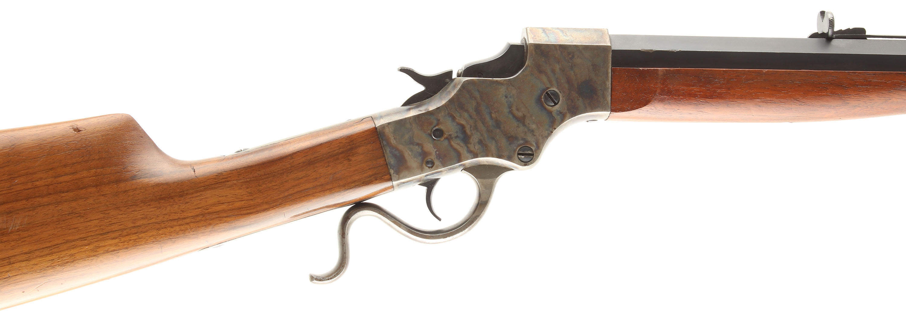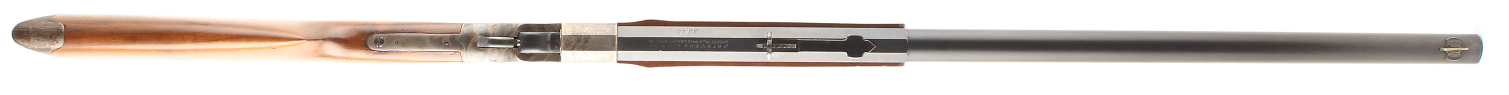 J. Stevens A. & T. Co., Model No. 44, Cal: 32-40, MFG: 1894 - 1933, SN: 27214, Single Shot Rolling Block, 26'' Octagon to round barrel. The original straight grip wood stocks are excellent, with minor scratches or handling marks to the excellent orginal finish. The top of barrel is stamped ''J. STEVENS ARMS. & TOOL. CO. CHICOPEE FALLS.MASS. U.S.A. PAT. APR.17 94.'', while the left side is stamped ''32.40''. The SN is stamped on both the lower tang & the barrel. The original metal blue finish to the barrel rates 95%. The case-colored receiver displays fantastic case-colors. The barrel carries an adjustable rear & Rocky Mountain front sights. Bore is excellent. Stock carries a crescent metal buttplate. An overall excellent & original collector's grade Stevens 44 rifle. FFL or C&R Req. - Value: 600 to 1000
