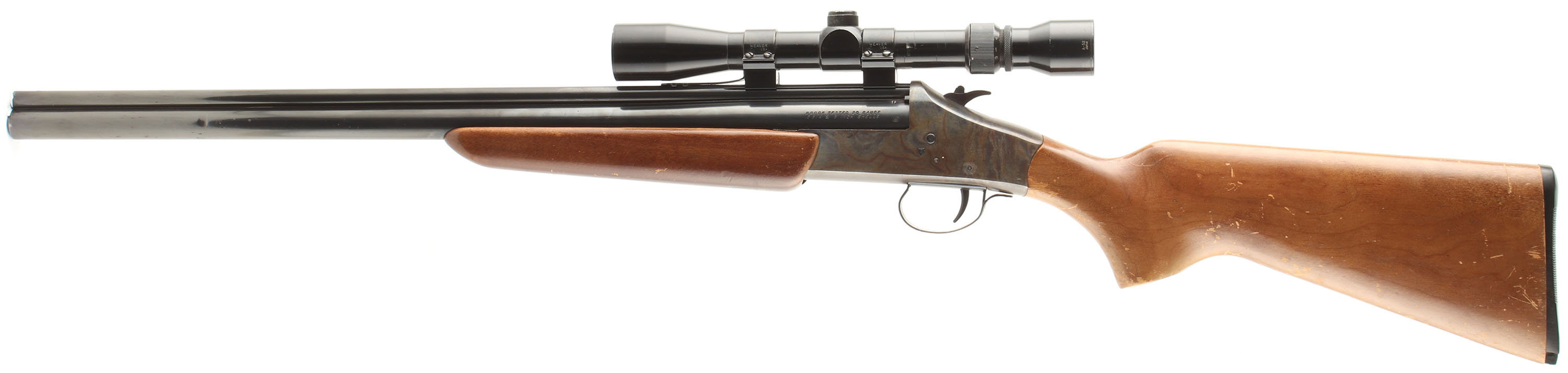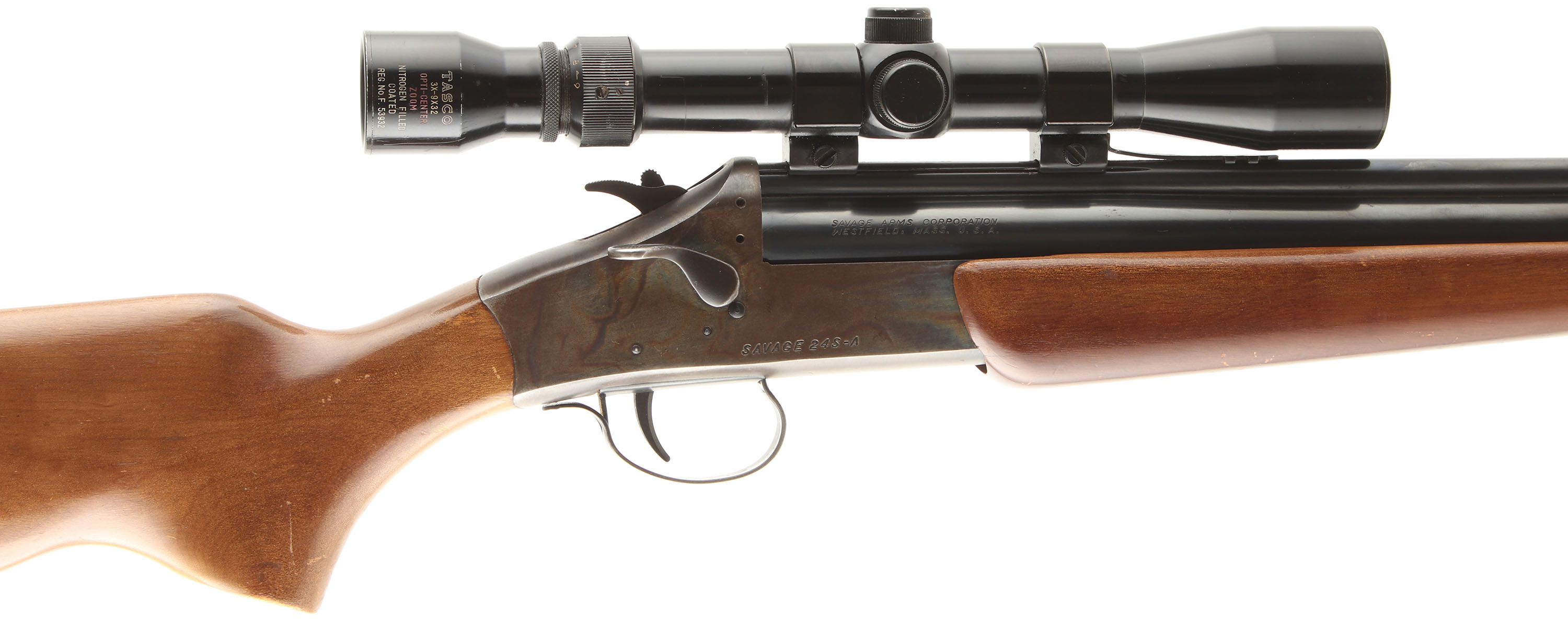 Savage, Model 24S-A Combo Rifle, CAL: .22 WIN MAG. RF/ 20 ga., MFG: 1964-67, SN: None, Break Action Single Shot Rifle/ shotgun comb, 2 3/4'' & 3'' shotgun chamber, 23 1/2'' barrels. The original flat pistol grip wood stocks are excellent, with numerous minor scrapes, scratches & light contusions to the original finish. The original metal blue finish rates 90% overall. The case-hardened receiver displays muted case-colors, Bores are excellent. The receiver carries a Tasco 3x-9x32 scope While the barrel carries the factory rear sight & no front sight. Stock carries the original black plastic buttplate, with a missing chunk at the toe. A popular & versatile combo firearm in one of the most sought after .22 Win Mag & 20 ga. combinations. Excellent overall condition. FFL or C&R Req. - Value: 450 to 750