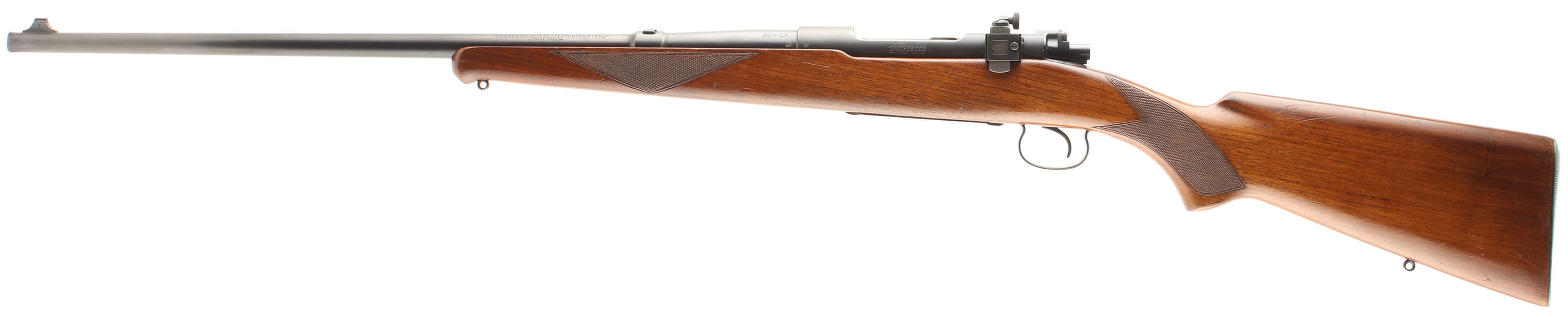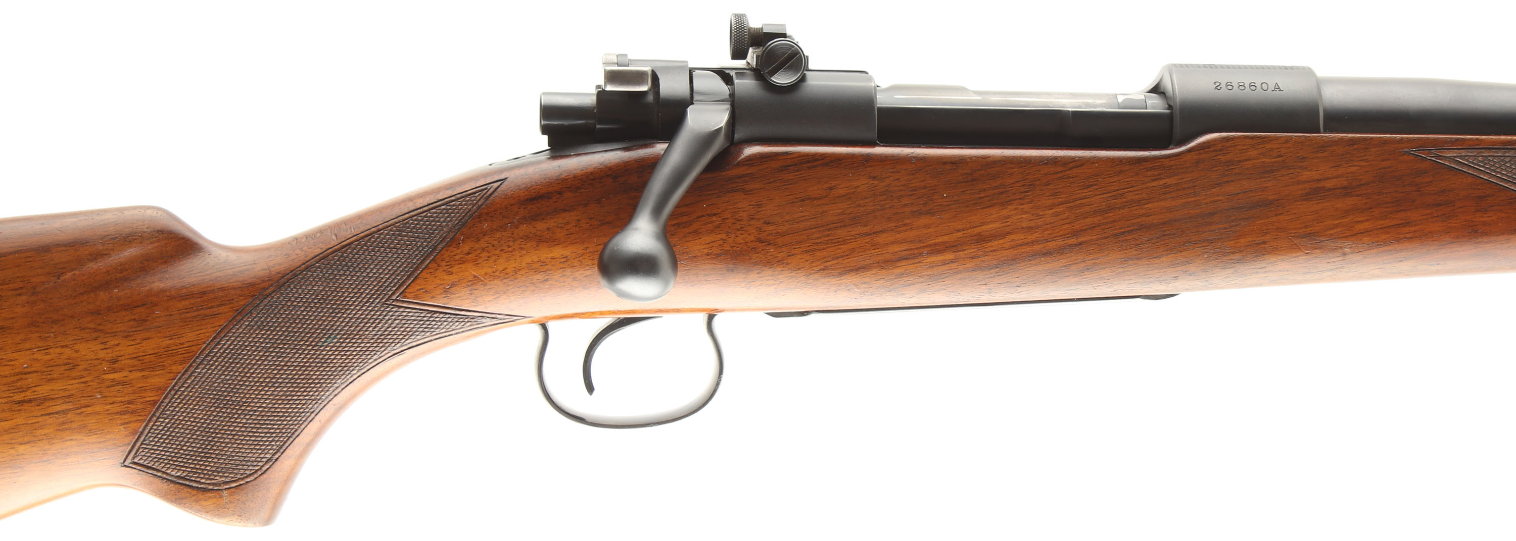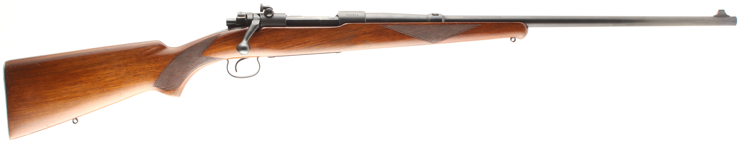 Winchester Model 54, CAL: .30-30., MFG: 1929, SN: 26860A, Bolt Action Rifle, 24'' barrel. The model 54 was the first successful civilian bolt action for Winchester. They are a fairly rare model with total production of just over 50,000 in all variations from 1925 to 36. The original checkered & flat pistol grip wood stock on this example is excellent, with several minor contusions, scrapes & scratches to the original finish, which is thinning at the carry point around the floorplate. The original metal blue finishes rate 90% overall. The floorplate & trigger guard display greater wear to about 40% coverage. Bore rates excellent. The rifle is fitted with the fully adjustable Redfield receiver sight, while the barrel has a blank filled rear dovetail & standard pinned blade front sight. Buttstock carries the original serrated metal buttplate. Sling eyelets. An overall excellent & original early Winchester bolt action. FFL or C&R Req - Value: 800 to 1200