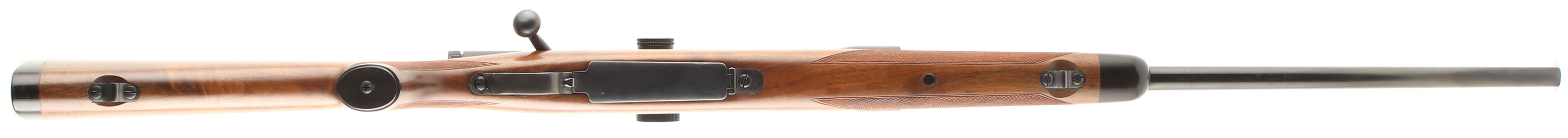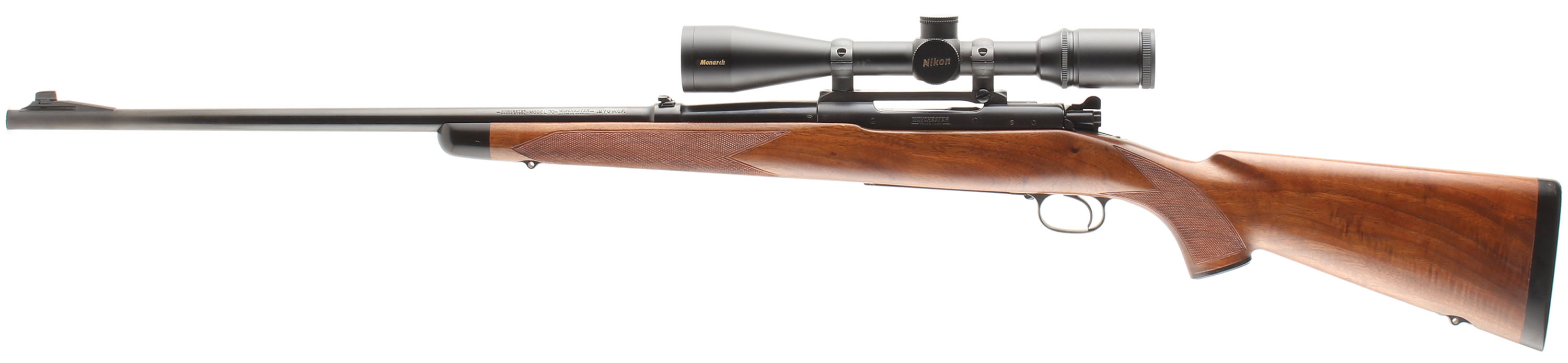 Winchester, Model 70, CAL: marked 270 WIN, MFG. 1941 (Pre-64), SN: 37611, 24'' Round tapered barrel. This rifle was fully & professionally refinished. The factory checkered & flat pistol grip wood stock is excellent, as professionally refinished. The hand cut checkering was expertly retraced & points are sharp. There are only a couple of handling marks or contusions to the excellent finish. Ebony forend tip & a non-factory plastic pistol grip cap. There was filler compound used in the stock along the edges of the barrel & along the top edge of the left side of the receiver where a scope mount preciously resided. Refinished appearance of the stock is excellent overall. The metal blue finishes have been restored rating 95% overall, with the finish on the floorplate & trigger guard not at professionally refinished & rating 80%. Two extra screw filled holes on the left side of receiver. Bore is excellent & bright. The receiver carries a Nikon Monarch 4-16X42 scope, while the barrel has single leaf folding rear & replaced ramp front sight. The stock carries a 3/4'' thicker plastic buttplate. Inlaid sling provisions. A nicely restored & sharp appearing pre-64 model 70. FFL or C&R Req. - Value: 700 to 1200