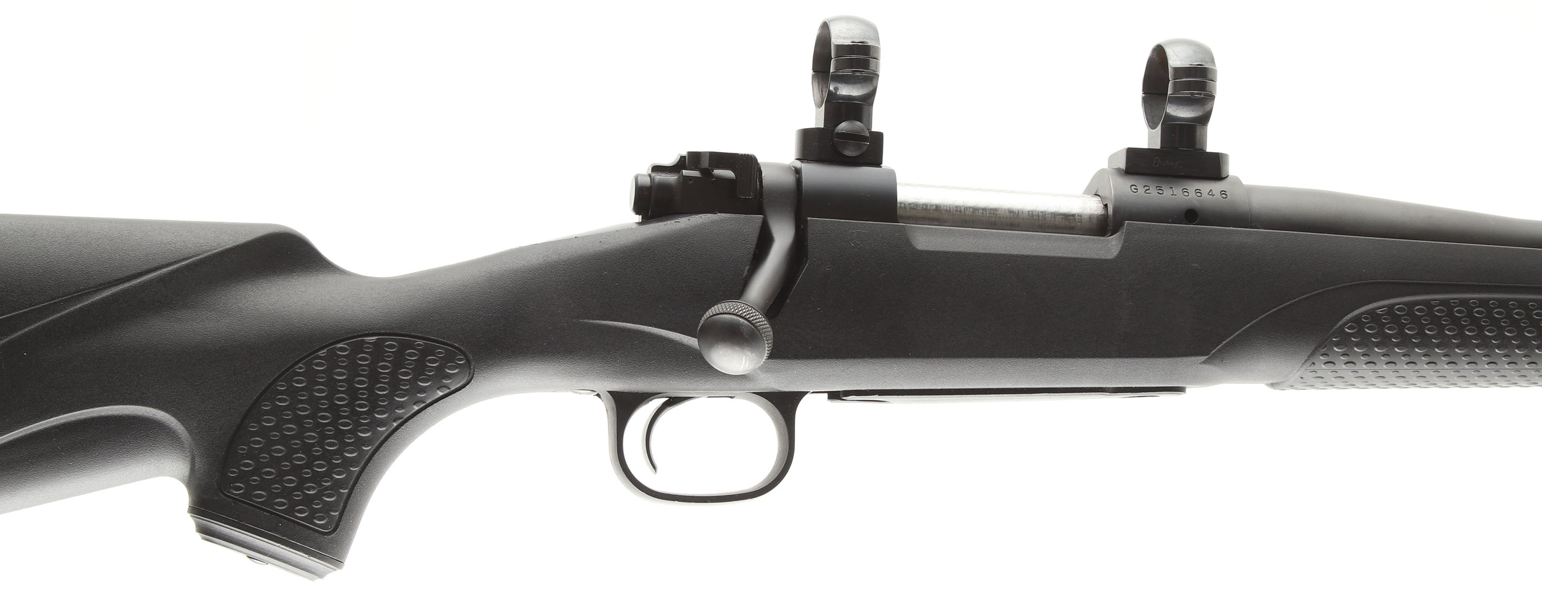 Winchester, Model 70, CAL: Marked 223 WSSM, MFG. 2003-2006, SN: G2516646, 22'' Round tapered barrel. The original black synthetic stock, with a flat pistol grip & textured grips is excellent, with few very minor rubs. The original metal blued finishes rate 99% overall. Bore is excellent & bright. The receiver carries Burris scope blocks & rings, while the barrel has no provisions for open sights. The stock carries the original solid rubber recoil pad. Sling studs. Jeweled bolt, with matching SN. A great all weather model 70 hunting rifle. FFL Req. - Value: 500 to 800