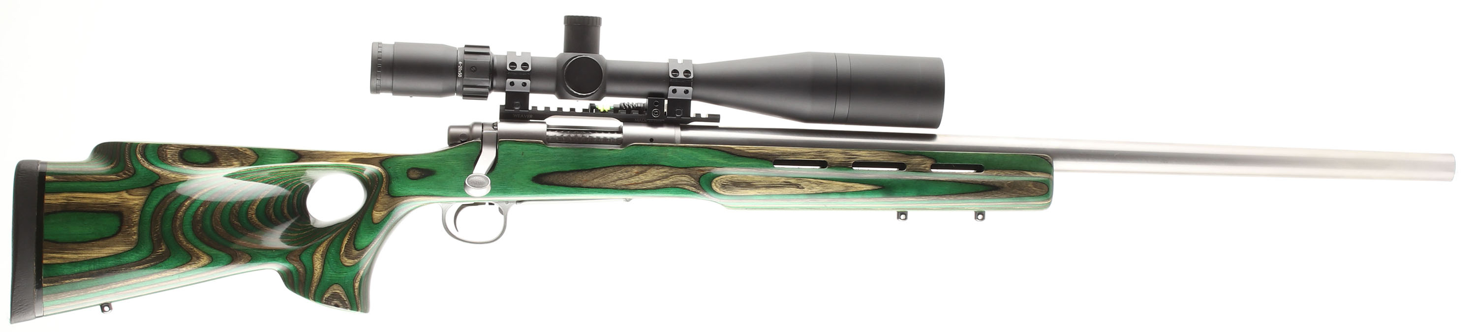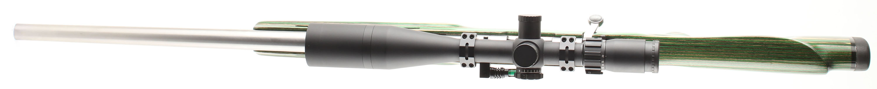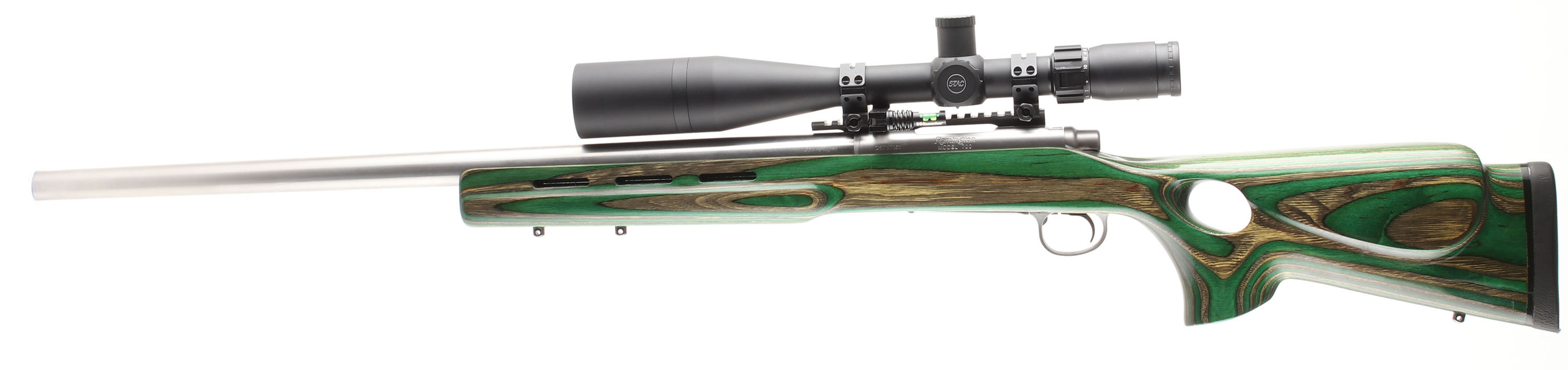 CUSTOM Remington, Model 700, CAL: 204 Ruger, MFG: Modern, SN: S6757161, Bolt Action Rifle, 26'' round barrel, The green, tan & black laminated & thumbhole pistol grip target wood stock, with forend vents, thumb rest & raised cheek is excellent. The custom stainless steel heavy barrel is excellent. The original metal stainless finish on the receiver rates excellent. Bore is excellent. The receiver holds a STAC Sightron 4-20x50mm Long Rang scope, with sun shade & a Wheeler Level, held by Weaver rings on a 7'' Weaver picatinny rail. No open sight provisions. Custom lightweight trigger. Trigger pull is extremely light, so much so, that once cocked & with safety off, the firing pin occasionally fires if the bolt hand is wiggled. Buttstock carries a Decelerator solid recoil pad. Sling studs. This custom bench rifle comes from the collection of Rod Sheets. FFL Req. - Value: 1000 to 1500