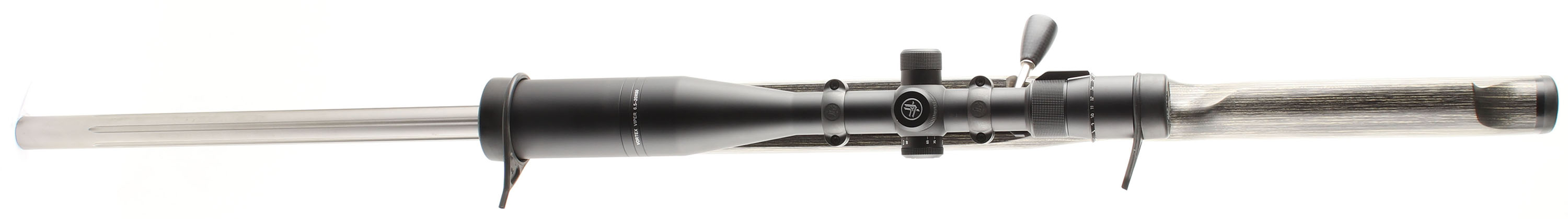 Kimber (NY), Model 84M Longmaster VT, CAL: 22-250 REM, MFG: Modern, SN:KM43757, Bolt Action Rifle, 26'' barrel. The grey, tan & black laminated & flat pistol grip wood bench stock is excellent, with a couple of minor rubs to the excellent original finish. The factory stainless steel fluted heavy barrel is excellent. The original metal satin blue finish on the receiver rates 99%. Bore is excellent. The receiver holds a Vortex Viper 6.5-20X50 Long Rang scope mounted on Leupold mounts, with sun screen & rubber caps. No open sight provisions. Carbon fiber bolt handle. Buttstock carries a Kimber solid recoil pad. Sling studs. FFL Req. - Value: 1400 to 2000