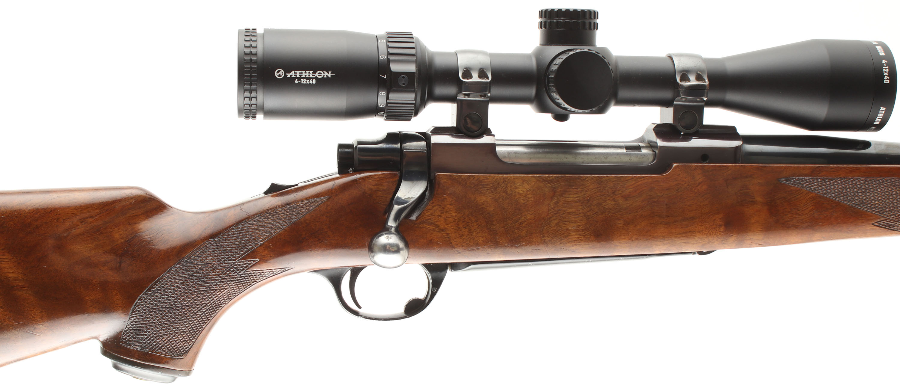 Ruger, Model M77, CAL: marked 270 WIN, MFG. 1981, SN: 75-85319, 22'' Round tapered barrel. The factory checkered & capped pistol grip wood stock is excellent, with several light scratches, minor contusions & rubs to the original finish, which is thinning from use, particularly around the pistol grip & forend. The pistol grip cap has an inlaid 270 cartridge case head. The original metal blue finish rates 80% on barrel, 90% on the receiver, toned plum, While the floorplate & trigger guard show additional wear & scratches. Bore is excellent. The receiver carries an Athlon 4-12x40 scope , while the barrel has no open sight provisions. Stock carries a Ruger solid rubber recoil pad & a forend mounted folding & adjusting bi-pod. Sling studs. Previous owner used this as a target & bench hunting rifle. FFL Req. - Value: 500 to 800