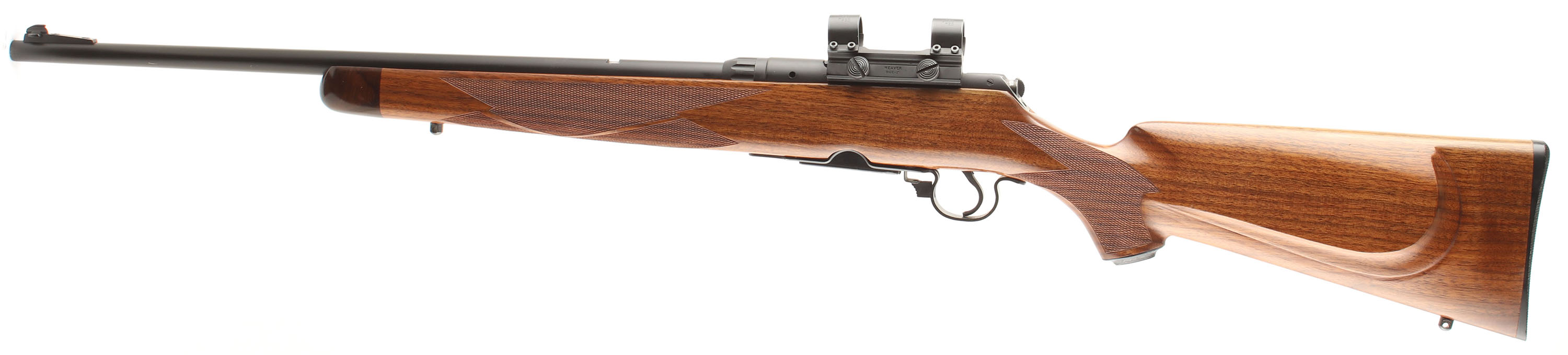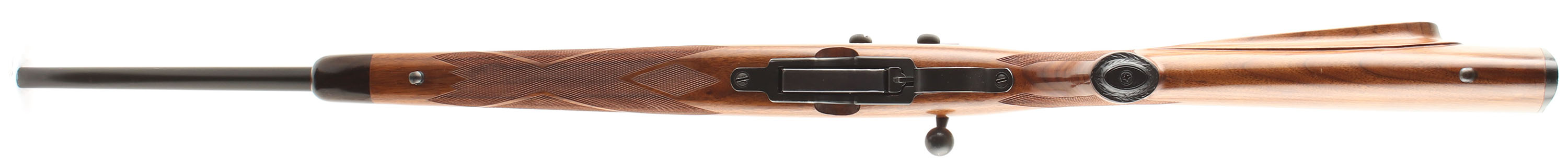 Savage, Model 340, CAL: 30-30, MFG: 1950-68, SN: None, Bolt Action Rifle, 22'' Round barrel. The updated Bishop cheeked, checkered & capped pistol grip wood stock is excellent, with rosewood forend cap. There are virtually no handling marks to the excellent finish & excellent sharp checkering. The metal blue refinish rates 99% overall, trigger guard & mag show additional wear. Bore is excellent & bright. The receiver carries a Weaver 1'' side mount scope base & ring set ready for a scope, while the has an open rear dovetail & ramped Marbles Sheard blade front sight, The buttstock carries a Bishop checkered plastic buttplate. Sling studs Original detachable mag. Sling loops. FFL or C&R Req. - Value: 250 to 450